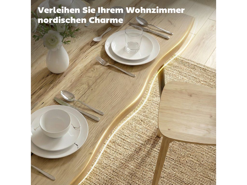 Moderní severský styl: Vzhled dubového dřeva, černé ocelové nohy a zaoblené hrany dodávají kuchyňskému stolu příjemný vzhled a charakter masivního dřeva, což z něj činí stylový prvek v moderních domácnostech.
