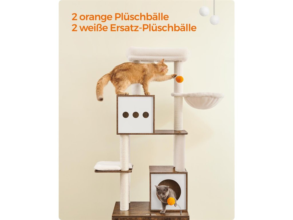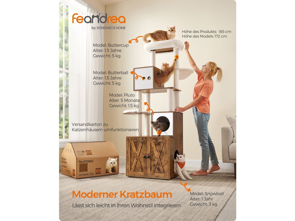 Snadná integrace do vaší domácnosti: Tento škrabací sloupek pro kočky, který kombinuje vintage hnědou a bílou barvu, se hodí k většině stylů domů a dodá atraktivní kouzlo každé místnosti.DOMEČEK PRO KOČKY 2 V 1 Strom pro kočky a skříňka na stelivo v jednom - Tento nábytek pro kočky nabízí vašemu chlupatému příteli vlastní prostor. Postavte ji do rohu a vše potřebné budete mít na jednom místě - skutečná úspora místa!.Skákání, pozorování, škrábání: Víceúrovňová konstrukce usnadňuje nastupování a vystupování. Plošina v horní části je ideální pro pozorování. Více škrabadel uspokojí přirozený instinkt vašich chlupatých čumáků.Pohodlné a nadýchané: Polštáře jsou vyrobeny z 500 g/m² plyše - ještě měkčího a nadýchanějšího než běžný plyš. aby si vaši čtyřnozí přátelé mohli na tomto škrabadle pro kočky pohodlně odpočinout a zdřímnout.Snadné čištění Díky skříňce na kočičí stelivo vypadává méně kočičího steliva; povrch se snadno čistí hadříkem; Polštář lze čistit válečkem na žmolky nebo hřebenem na kočky, kromě toho je snímatelný a lze jej prát v pračce;| Kategorie: | Škrabadla pro kočky |