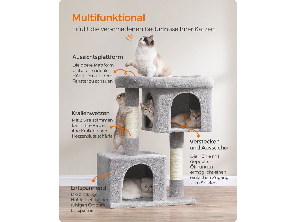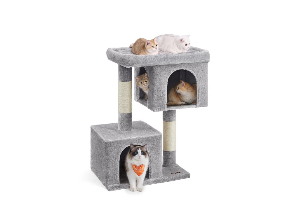 Věž pro kočky, XL, kotec pro extra velké kočky do 20 kg, velké kočičí bidýlko, 2 kočičí jeskyně, škrabadlo, světle šedá.