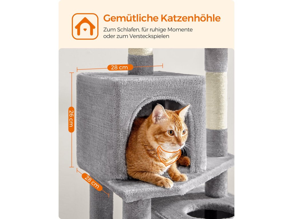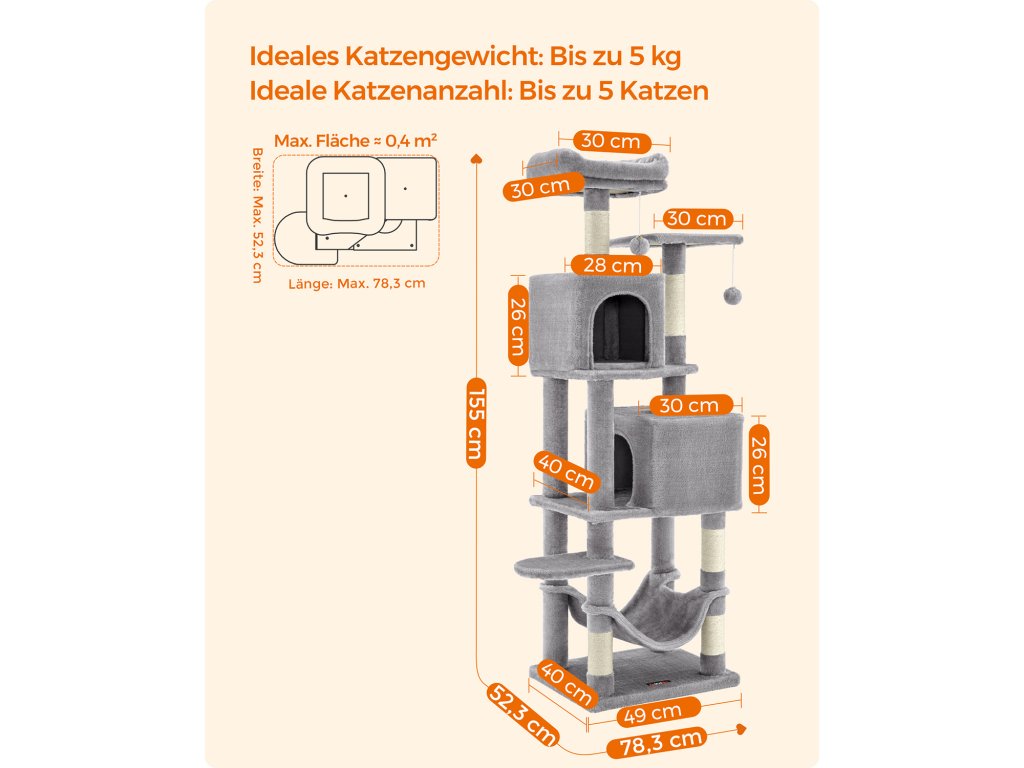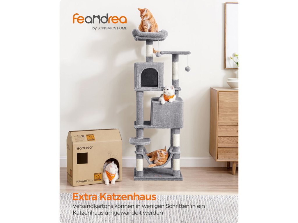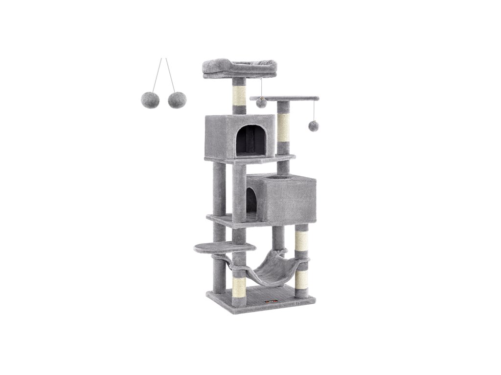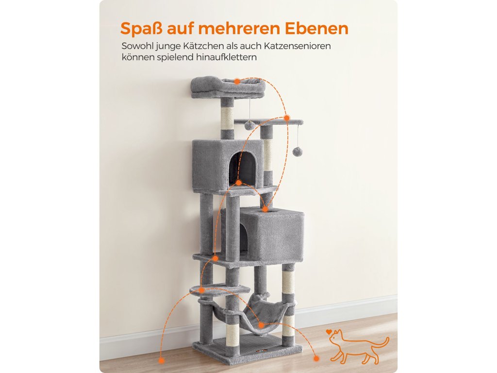 Škrabadlo pro kočky Feandrea, 155 cm kočičí věž pro vnitřní kočky, plyšový vícepatrový kočičí byt s 5 škrabadly, 2 jeskyněmi, houpací sítí, 2 bambulkami, světle šedý PCT192W01