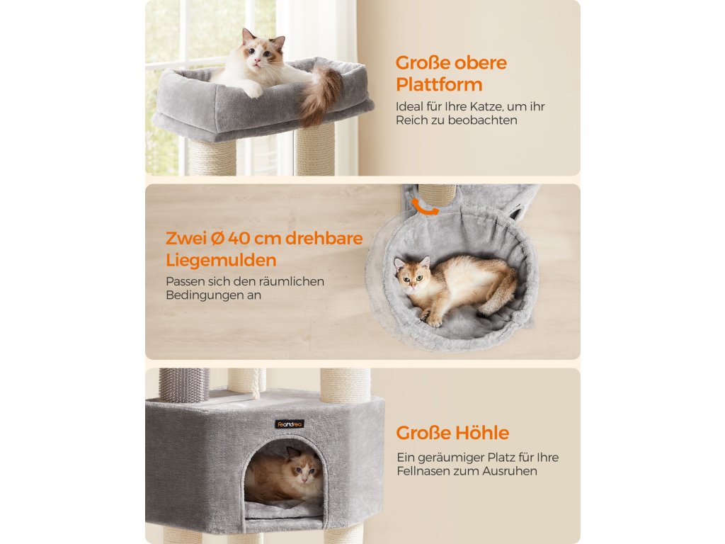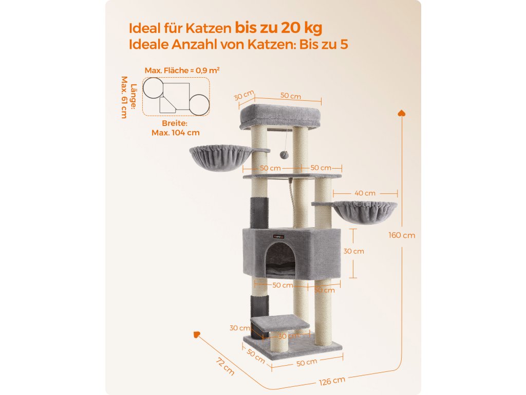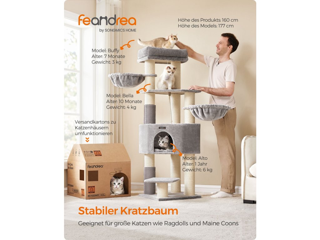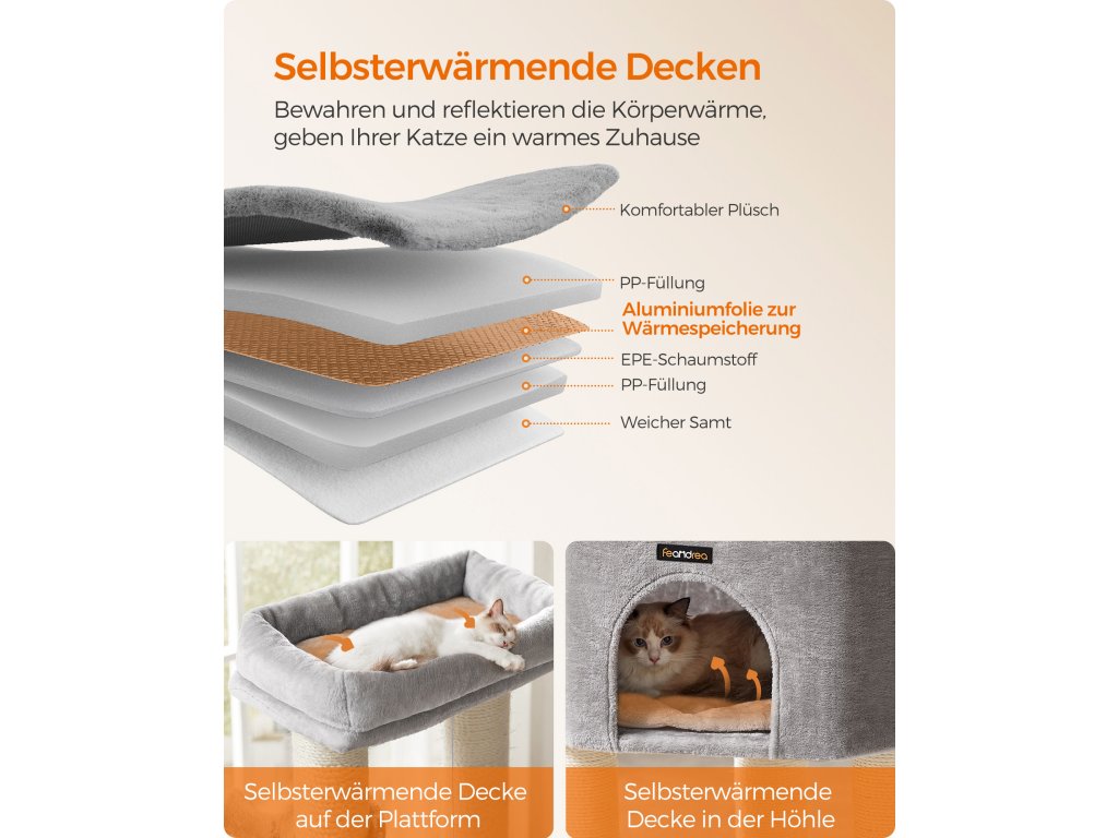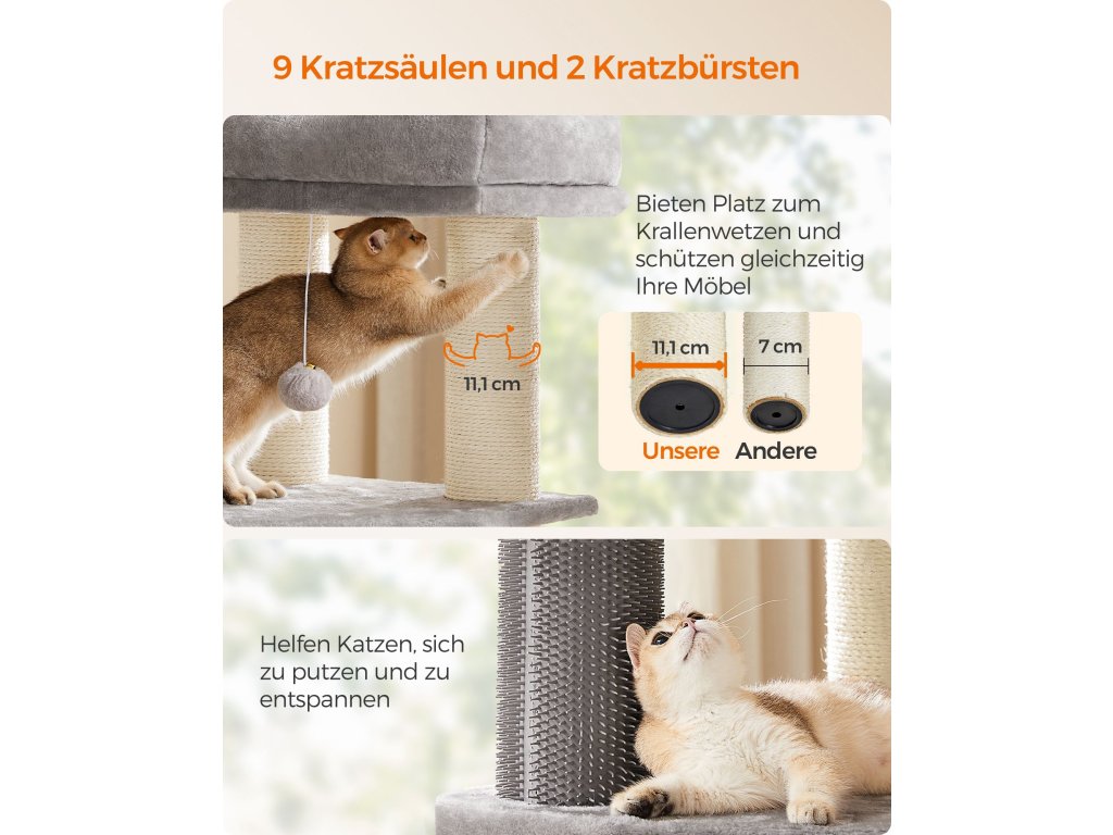 Samohřejivé polštářky Horní kočičí bidýlko a jeskyně jsou vybaveny pohodlnými polštářky, které absorbují, zadržují a odrážejí tělesné teplo vaší kočky. poskytují vašim chlupáčům tolik potřebné teplo a udržují je v útulném a příjemném prostředí.9 tlustých škrabadel Kočky milují škrábání. S 9 odolnými škrábacími sloupky, které jsou obaleny 5,6 mm průměrem. Díky silným sisalovým provazům se mohou s tímto kočičím stromem do sytosti poškrábat a nechat vaši pohovku jít!.2 kočičí samoopalovače Ať už jde o snadno dostupné potírání nebo rychlé zklidnění svědění či podráždění, tyto kočičí samoopalovače vám usnadní péči, i když jste pryč.Snadné čištění Kryt a podložka kočičího bidýlka v jeskyni jsou odnímatelné a omyvatelné pro snadné čištění, takže je snadné udržovat hygienický životní prostor pro vaše kočky.Stabilní, pevný, bezpečný Díky zesílené základně o rozměrech 19,7" x 19,7" a silným tyčím o průměru 4,6" nabízí tento kočičí domek bezpečné hřiště, po kterém mohou šplhat i aktivní kočky. Pro větší bezpečnost je součástí balení sada proti převrácení.| Kategorie: | Škrabadla pro kočky |