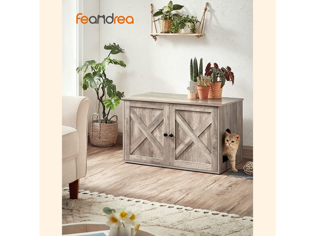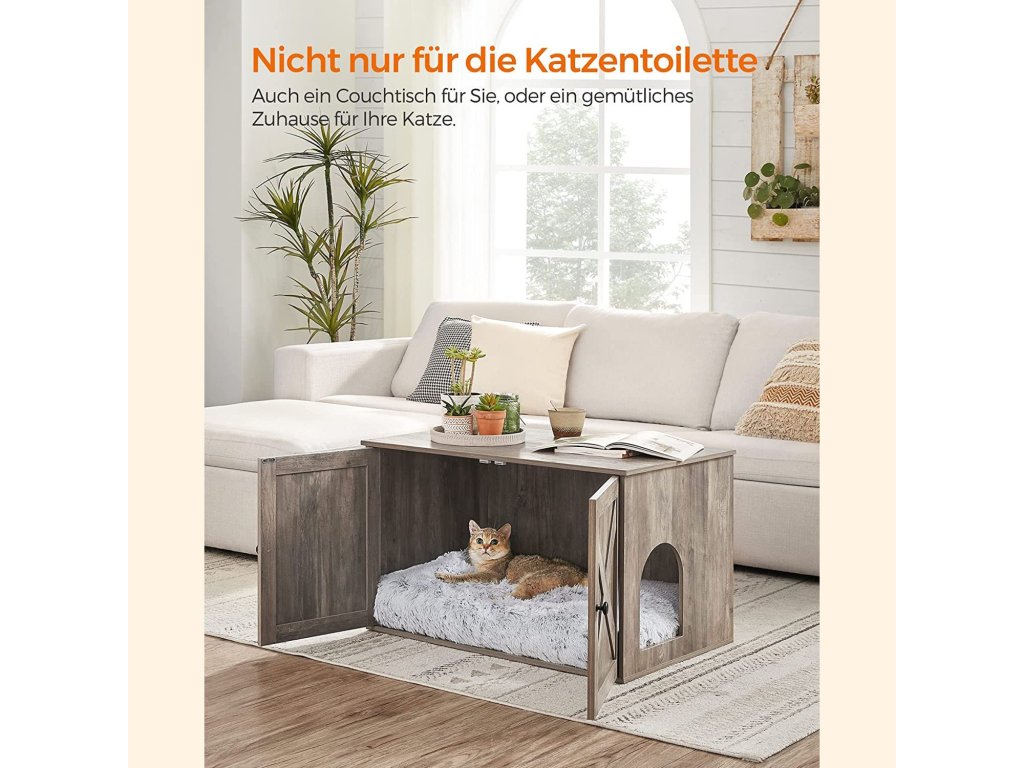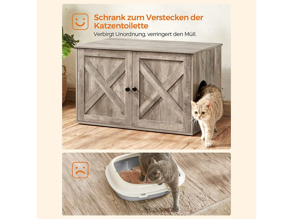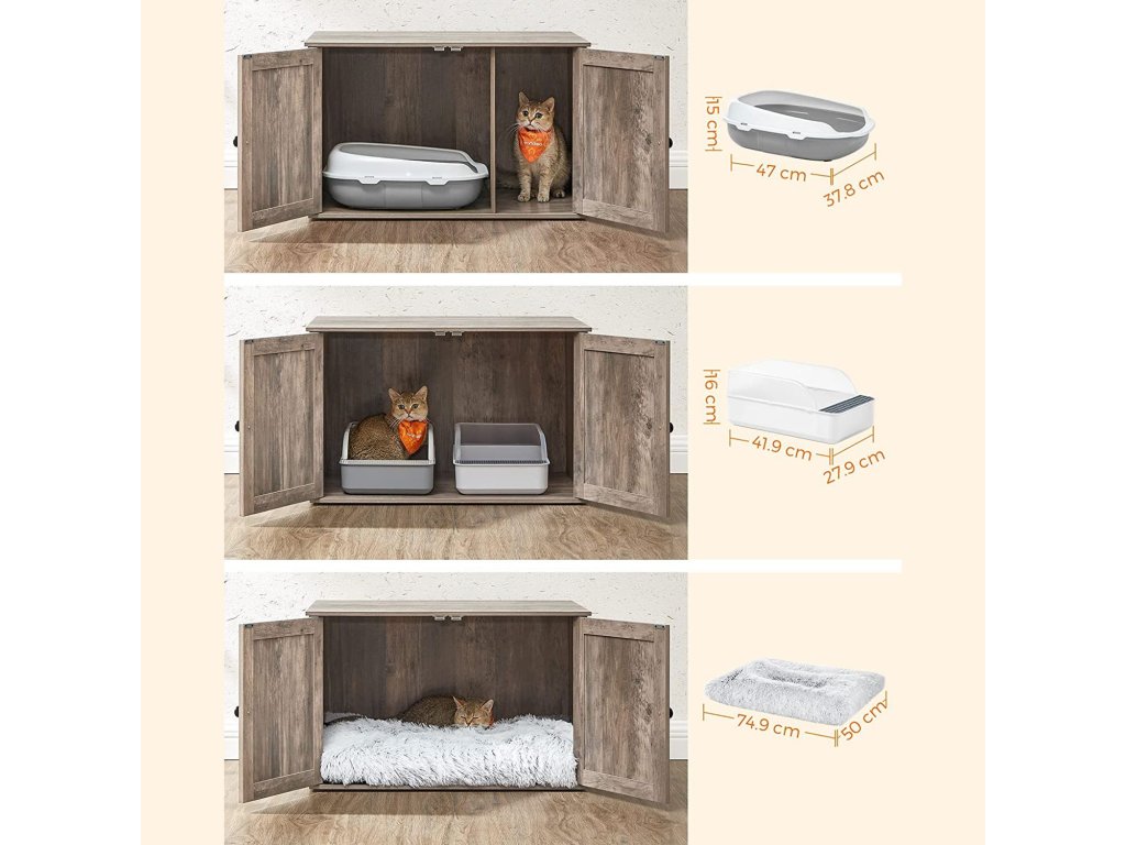 Stylová kočičí podestýlka Díky rustikálnímu stylu a elegantním dvířkům od stodoly se tato kočičí podestýlka snadno hodí do většiny obytných stylů a promění klidné místo vaší kočky v opravdovou atrakci.Více soukromí, méně zápachu Díky uzavřené konstrukci tento kočičí box poskytuje soukromé místo, kde se vaše kočka cítí bezpečně, aby mohla vykonat svou pohotovostní potřebu a kde vzniká méně nepořádku - řešení, které je výhodné pro všechny!Prostorný interiér: Hlavní prostor této skříňky pro kočky o rozměrech 50 x 50 x 46 cm nabízí dostatek místa pro většinu kočičích toalet. Dělicí příčku můžete také vyjmout a zvětšit tak plochu na 74,9 x 50 x 46 cm.Pro vaši kočku a pro vás Umístěte do něj kočičí misku, použijte ho jako odkládací stolek nebo do něj umístěte kočičí pelíšek, abyste si vytvořili útulný úkryt.Snadná instalace Vaše kočka se už nemůže dočkat, až si vyzkouší nový nábytek? Žádný problém, protože díky návodu krok za krokem a označeným dílům je tento kočičí domeček připraven za 20 minut.| Kategorie: | Toalety pro kočky |