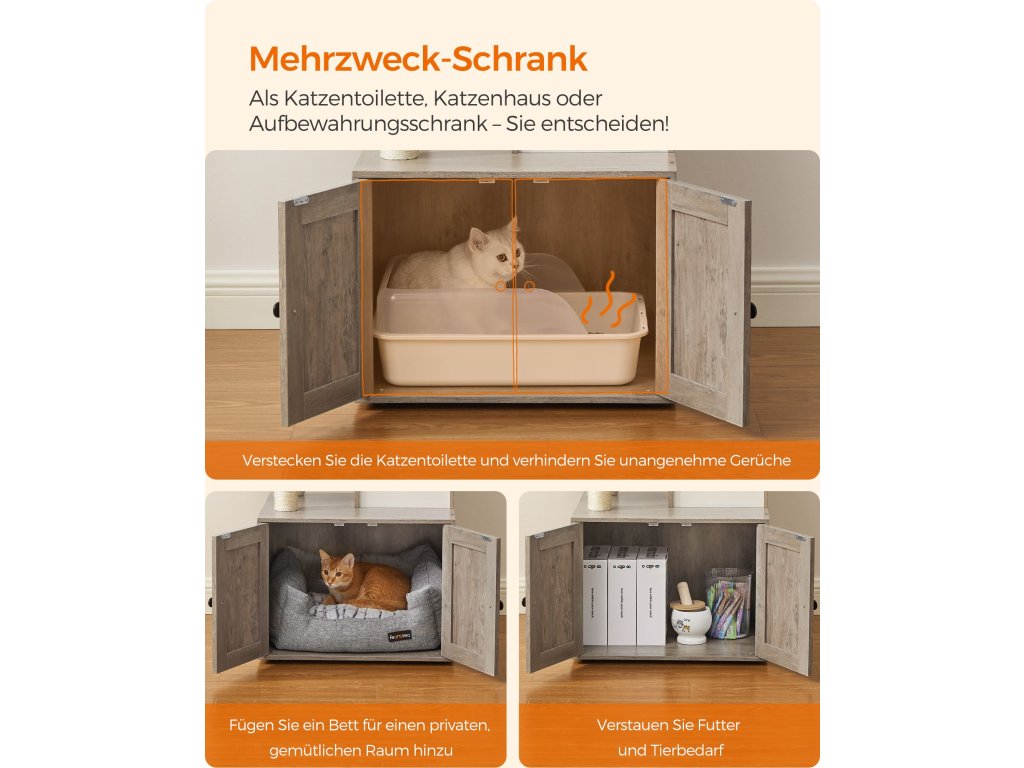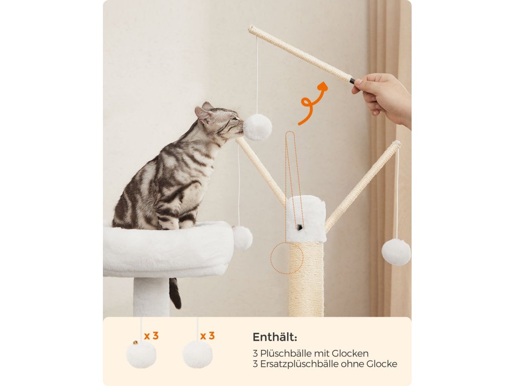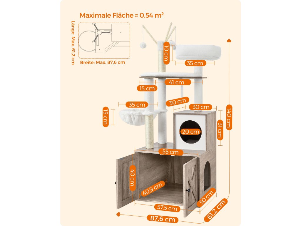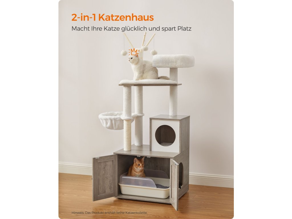 Nábytek pro kočky 2 v 1 Díky kombinaci škrabadla a kočičího boxu získá vaše kočka místo pro pozorování, hraní, odpočinek a vykonávání svých nouzových potřeb. ale zabírá pouze 57,5 x 50 cm - skutečná úspora místa.Neomezená zábava a pohodlí 3 odnímatelné plyšové tyče s míčky, sisalové sloupky, dobře polstrovaná horní plošina, plyšová kočičí jeskyně a huňatý prostor na spaní - s tímto škrabadlem se vaše kočky nebudou nudit.Více soukromí, méně zápachu Díky uzavřené konstrukci poskytuje tato kočičí toaleta soukromé místo, kde se vaše kočka cítí bezpečně při vykonávání svých nouzových potřeb a kde je méně nečistot. Lze jej použít také jako kočičí domek nebo k uložení příslušenství pro domácí mazlíčky.Odolné: Vyrobeno z dřevotřísky a vysoce kvalitního přírodního sisalu, je stabilní pro kočky, které po něm mohou šplhat nahoru a dolů, odolné proti opotřebení a poškrábání neposednými drápky a trvanlivé pro dlouhodobý požitek.Snadné čištění Všechny polštáře jsou odnímatelné a pratelné. Díky hladkému povrchu dýhovaných panelů můžete snadno otřít chlupy a nečistoty hadříkem - čištění tohoto malého kočičího stromu je hračka.| Kategorie: | Škrabadla pro kočky |