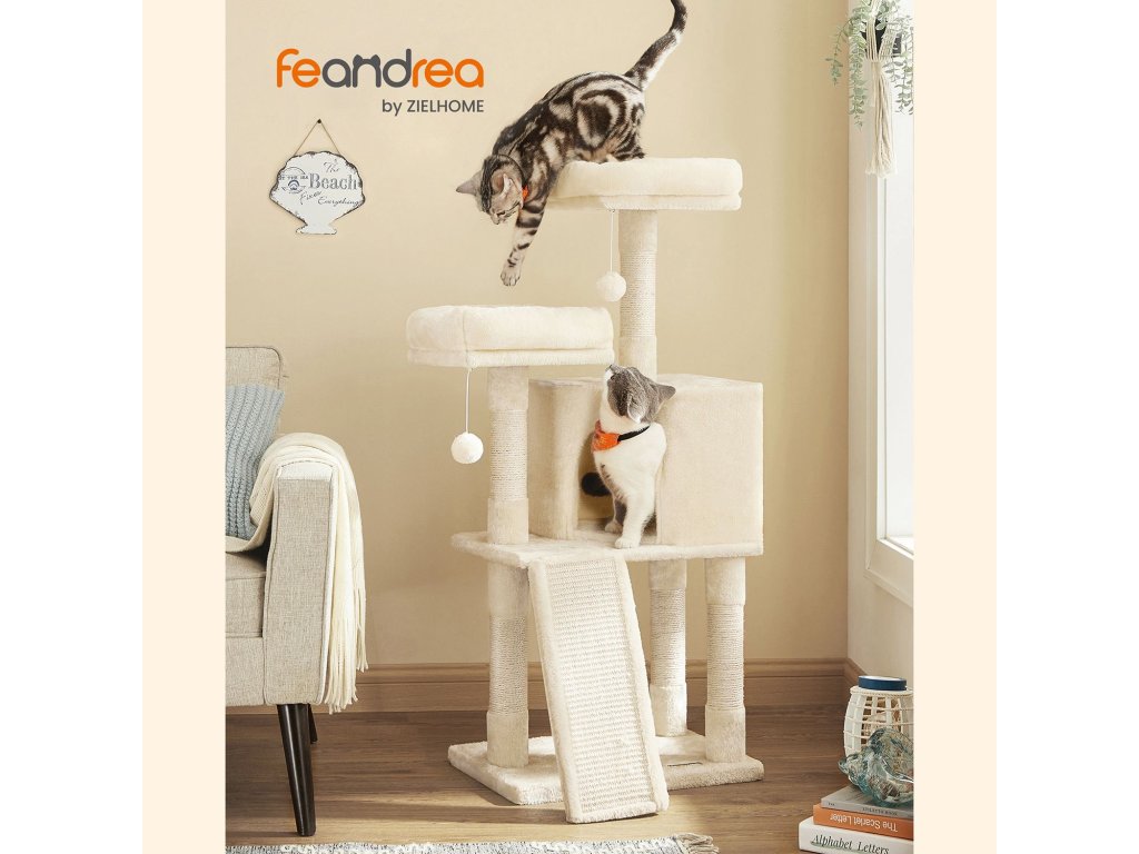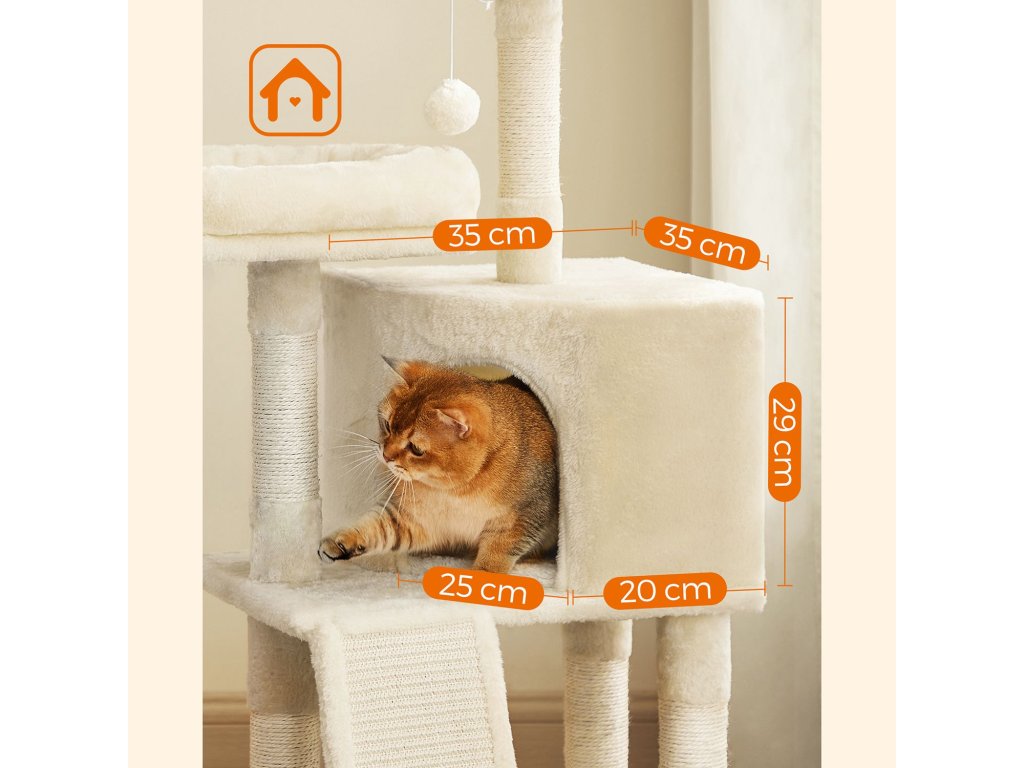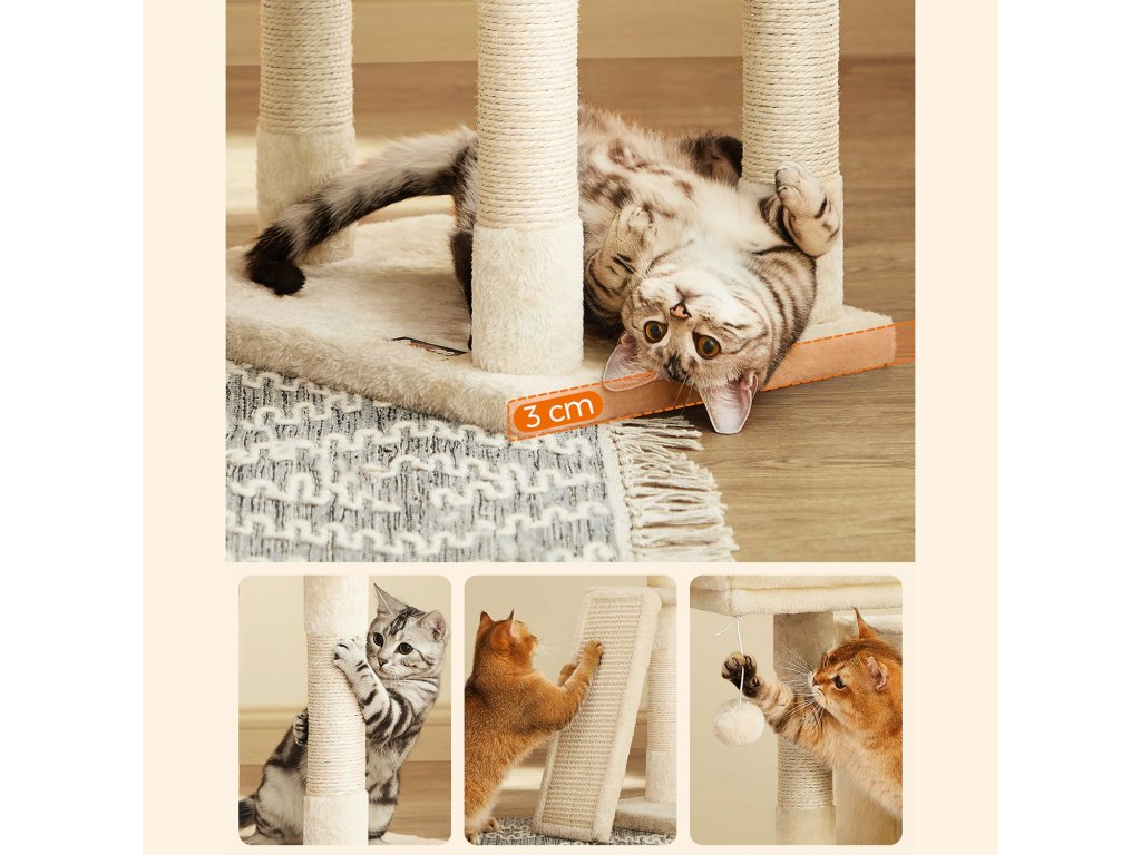 Hodiny zábavy při škrábání: 5 sloupků je omotáno sisalem. Zde a na velké škrabací desce si vaše kočka může brousit drápky podle libosti. Navíc je váš nábytek chráněn před drápky vašeho miláčka - nábytek vám děkuje!.Pro energickou kočku? Žádný problém! Tento kočičí strom má zesílenou základnu a ochranu proti překlopení, takže váš roztomilý uzlíček energie na něm může skákat.
