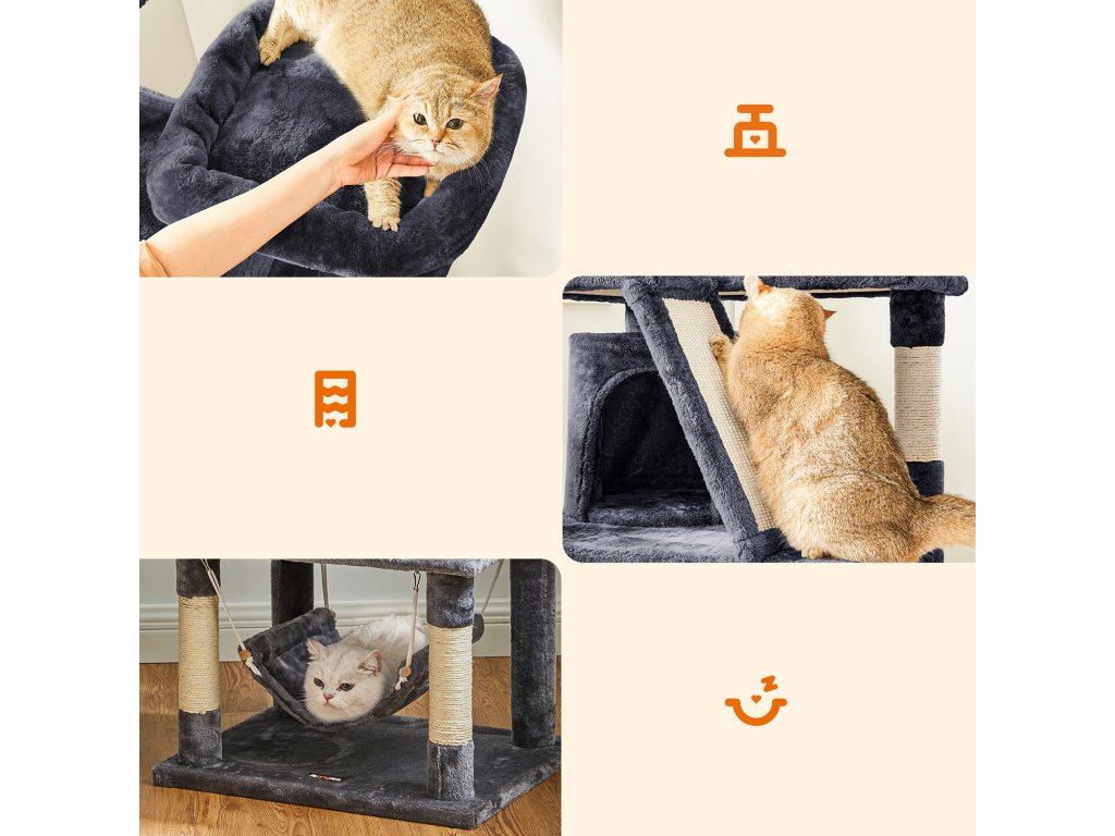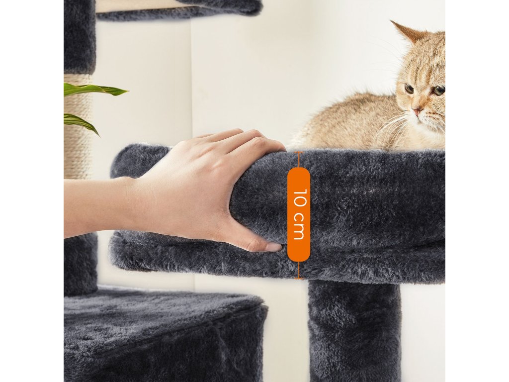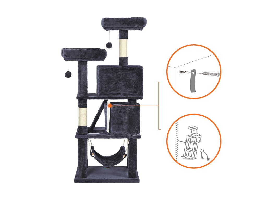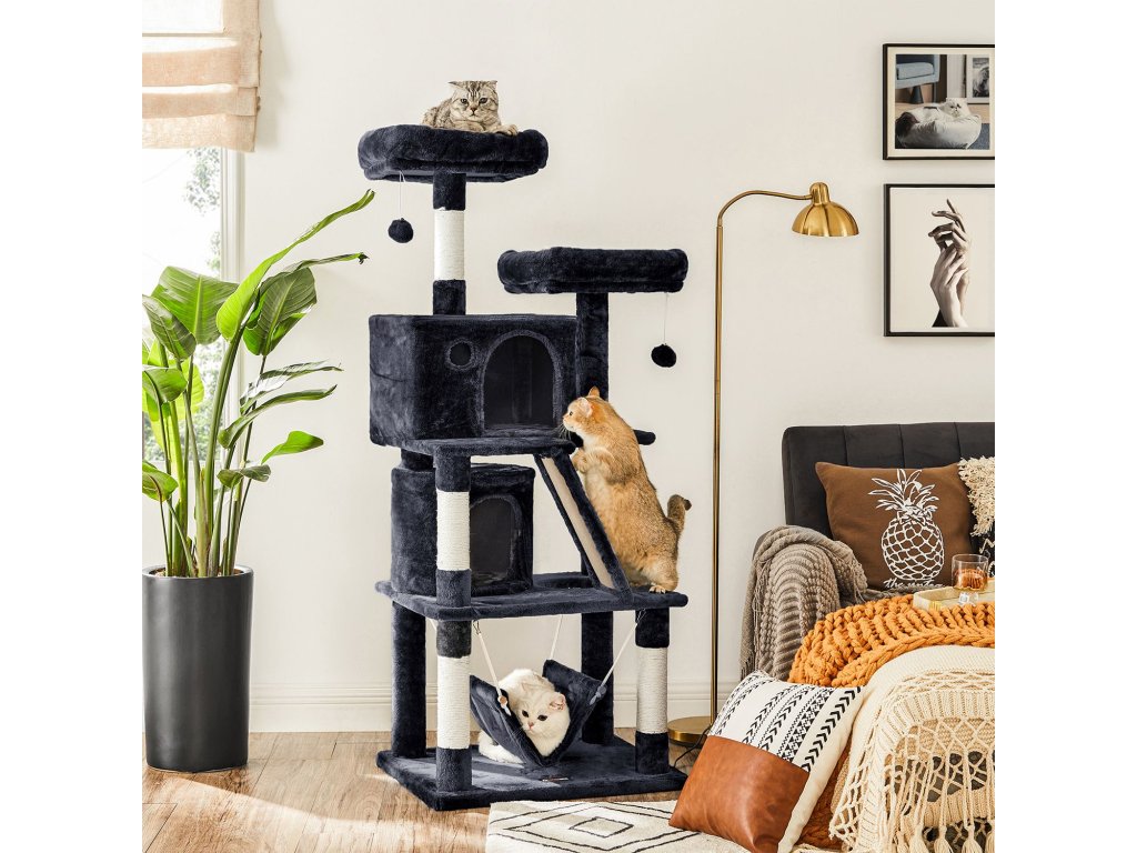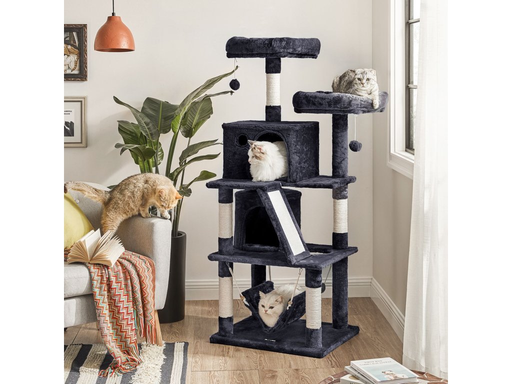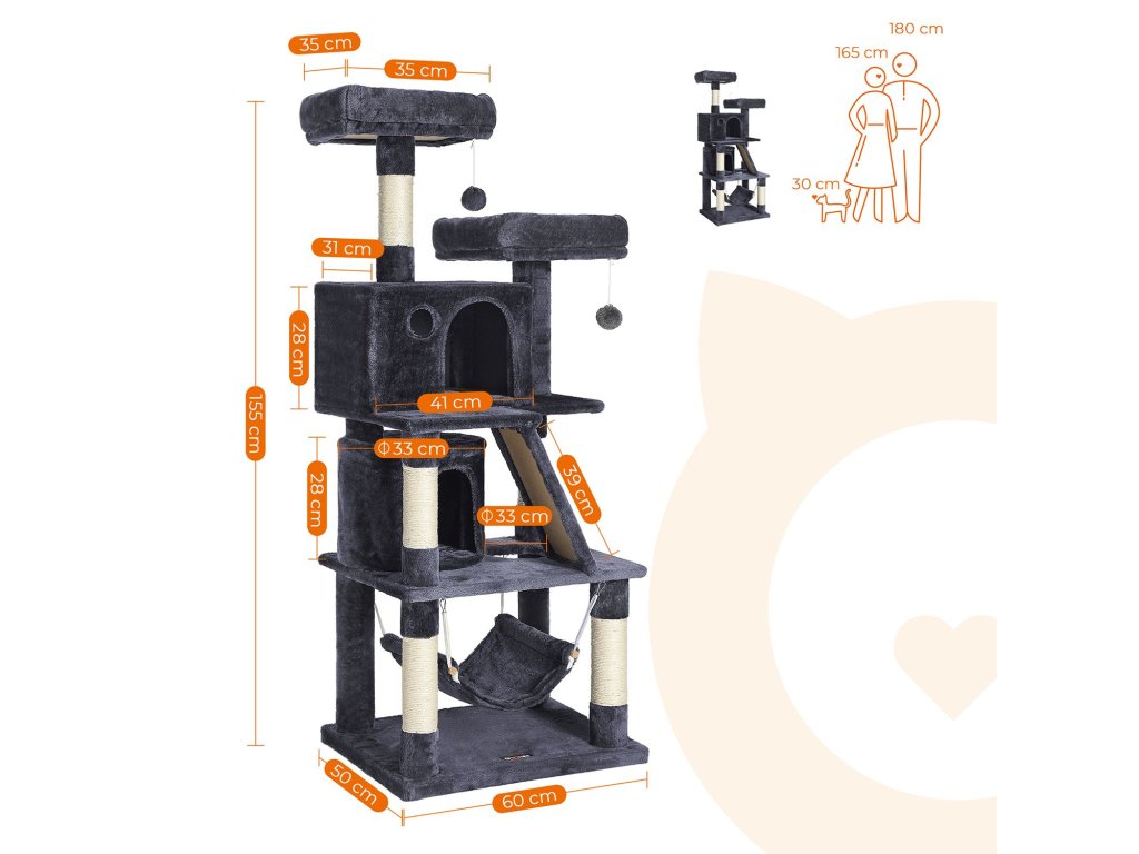 "Jen sen?" Ne, kotě, tohle není sen. 2 plyšové jeskyně, 2 vyhlídkové plošiny, 1 houpací síť, s otvorem pro šplhání a škrabadlem - tento kočičí strom (60 x 50 x 155 cm) bude tvým novým domovem.