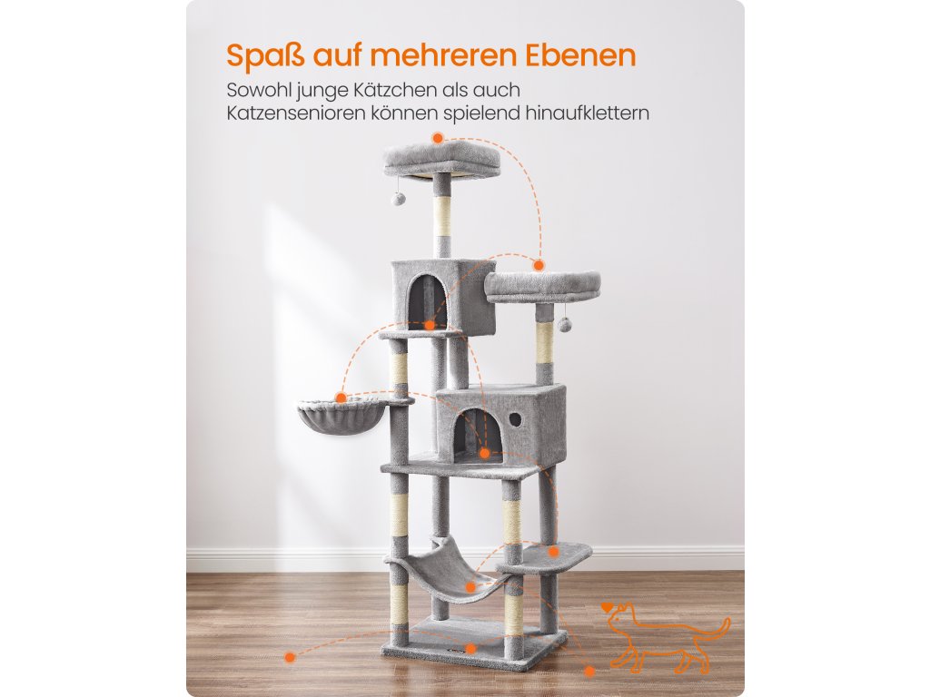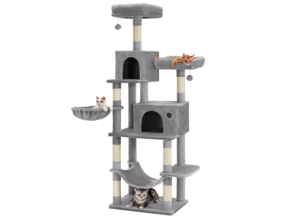Kočičí hřiště: Je krásné a má mohutnou konstrukci, která usnadňuje lezení a sestup. Kočky se rády pohybují nahoru a dolů. Bezpečné pro starší kočky a kočky, které nerady skáčou. Pomůže vám vyřešit nedostatek pohybu.Vícehlavý ráj - Tato nadýchaná výšková plošina se 2 podstavci je vhodná pro kočky a měkká těla, má tu správnou velikost pro pelíšek. Houpací síť velkých rozměrů pro větší pevnost a stabilitu.