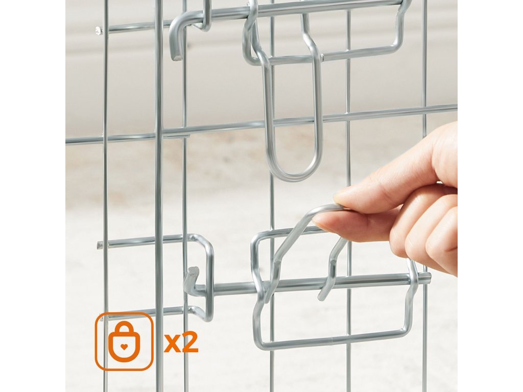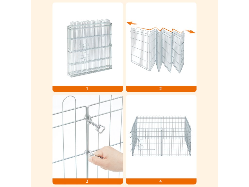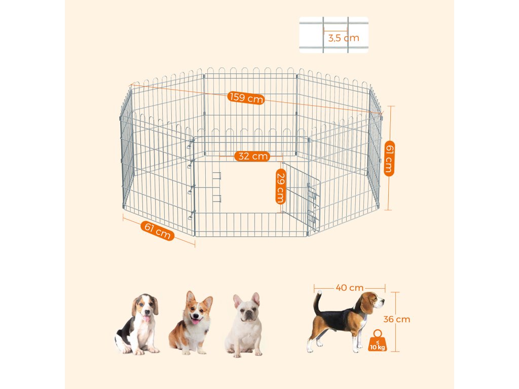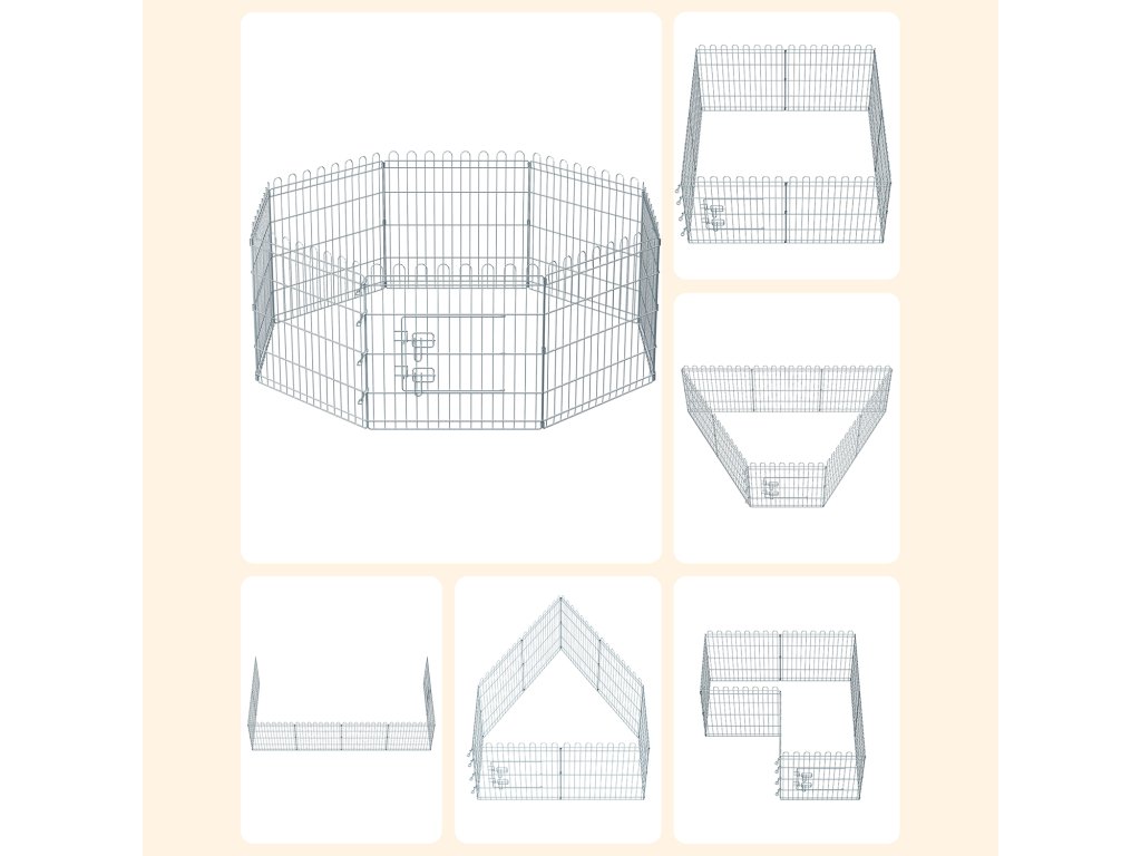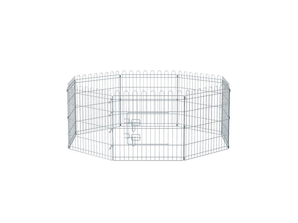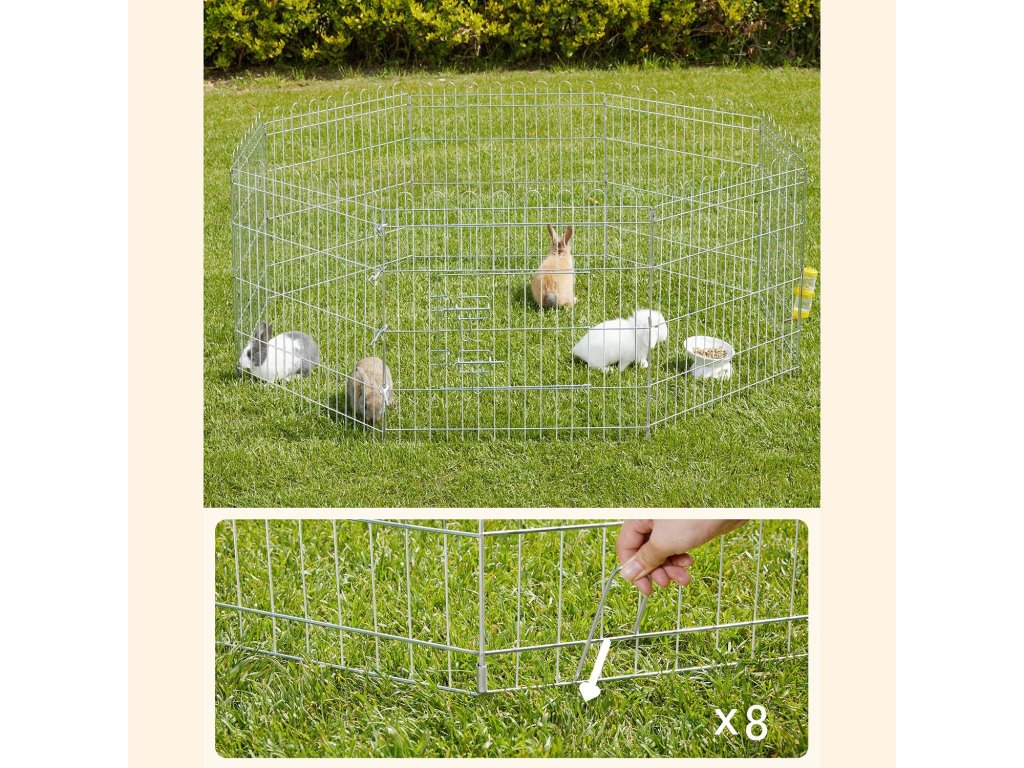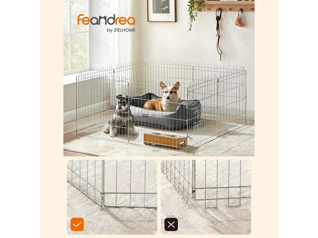 DIY provedení, různé tvary: tato ohrádka se skládá z 8 plotových panelů, které lze podle potřeby sestavit do čtverce nebo osmiúhelníku. Výška 61 cm je vhodná pro zvířata do 40 cm, např. pro psy, králíky a kuřata.Pro vnitřní i venkovní použití: při venkovním použití lze venkovní kryt připevnit k zemi pomocí 8 kolíčků, které jsou součástí dodávky. Při použití v interiéru zajišťuje plochá základna stabilní drženíSnadná instalace: není třeba žádné nářadí, stačí ohrádku pro malá zvířata rozložit a vytvarovat do správného tvaru, připevnit klipy a je připravena k použití.Dvojitá bezpečnostní konstrukce: dva zámky ve tvaru písmene L zajišťují dvojitou ochranu a zabraňují otevření dveří domácími zvířaty; zakřivený design na horní straně pelíšku bez otřepů zaručuje větší bezpečnost.Pečlivé zpracování: pozinkovaný povrch je odolný proti plísním a chrání kryt před povětrnostními vlivy; husté uspořádání drátů plotových prvků (vzdálenost mezi dráty 3,5 cm) zajišťuje dodatečnou bezpečnost;| Kategorie: | Ostatní pomůcky pro psy |