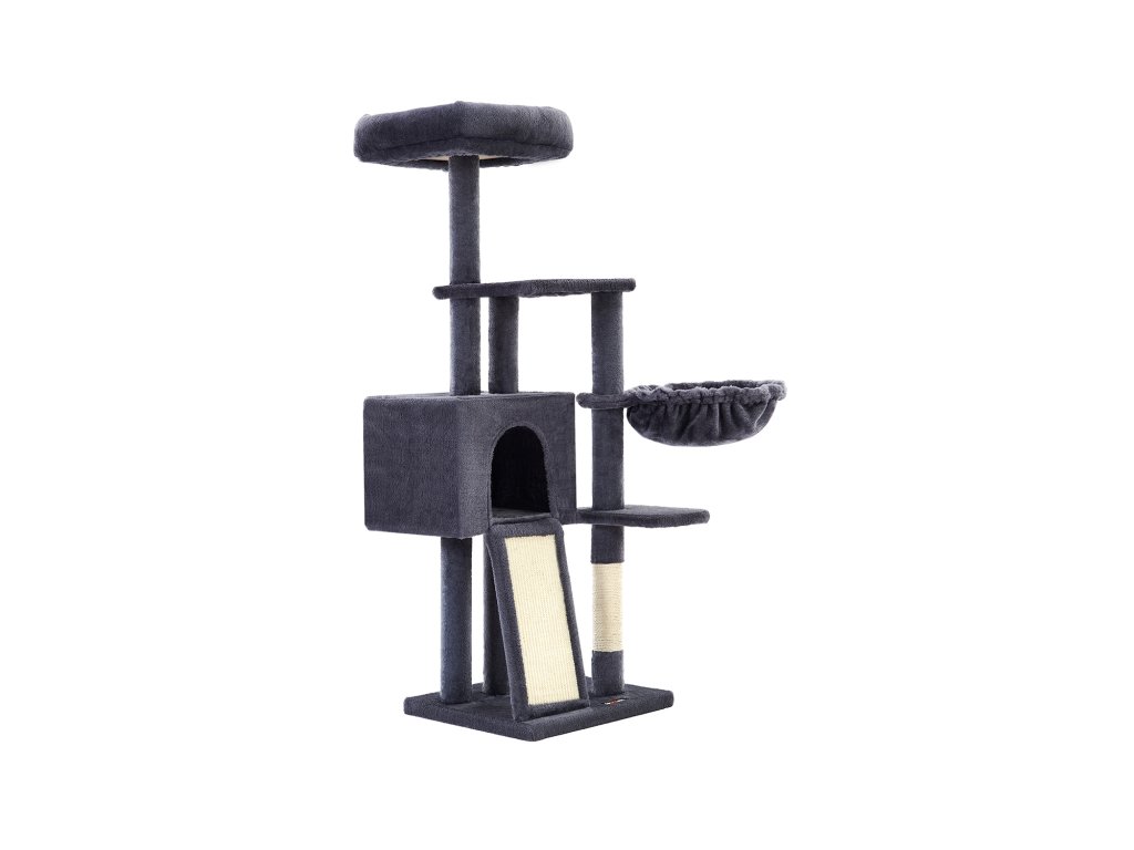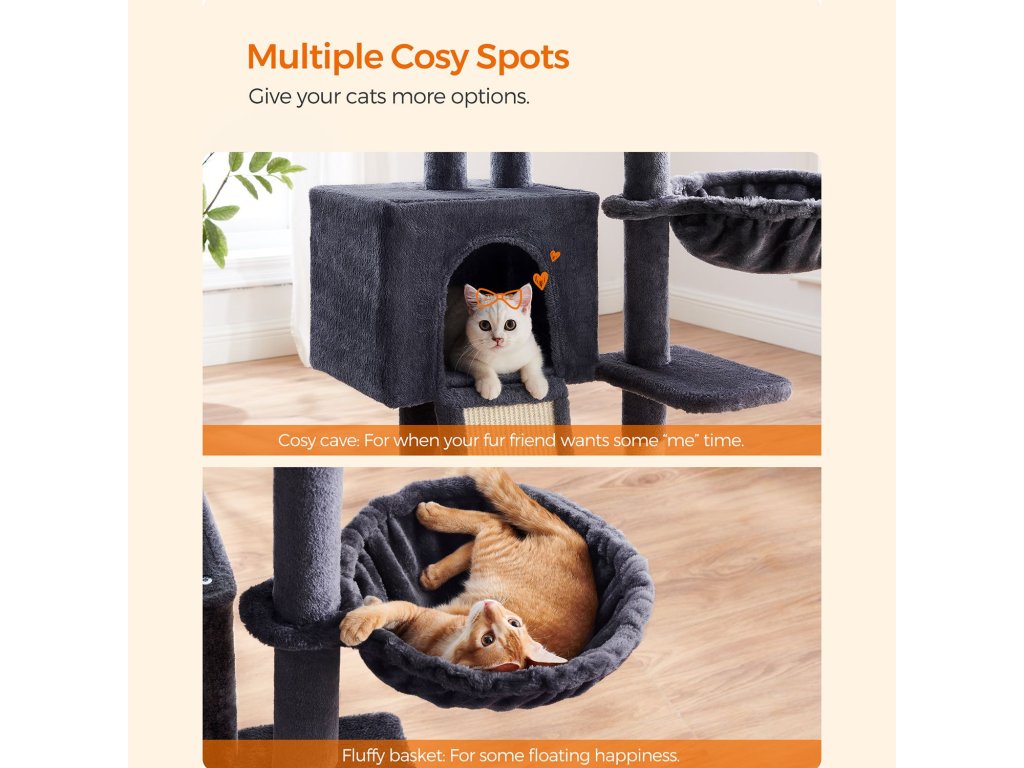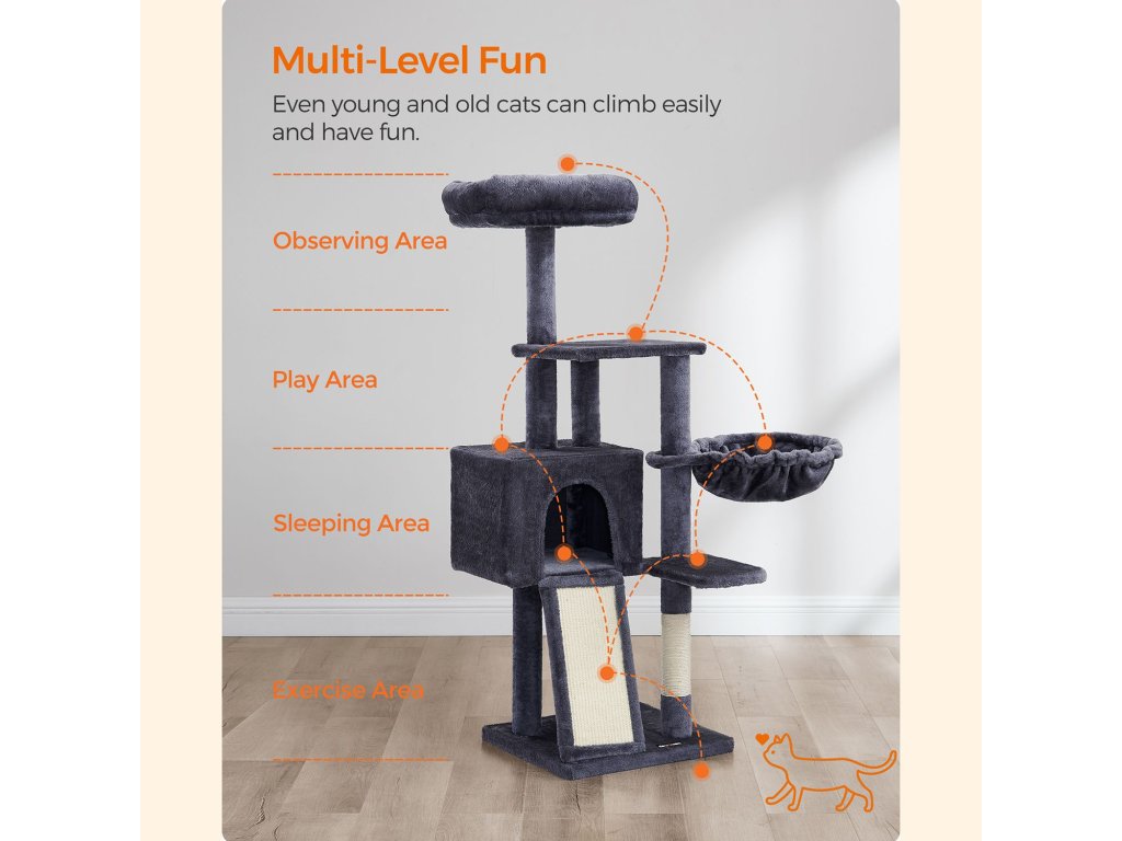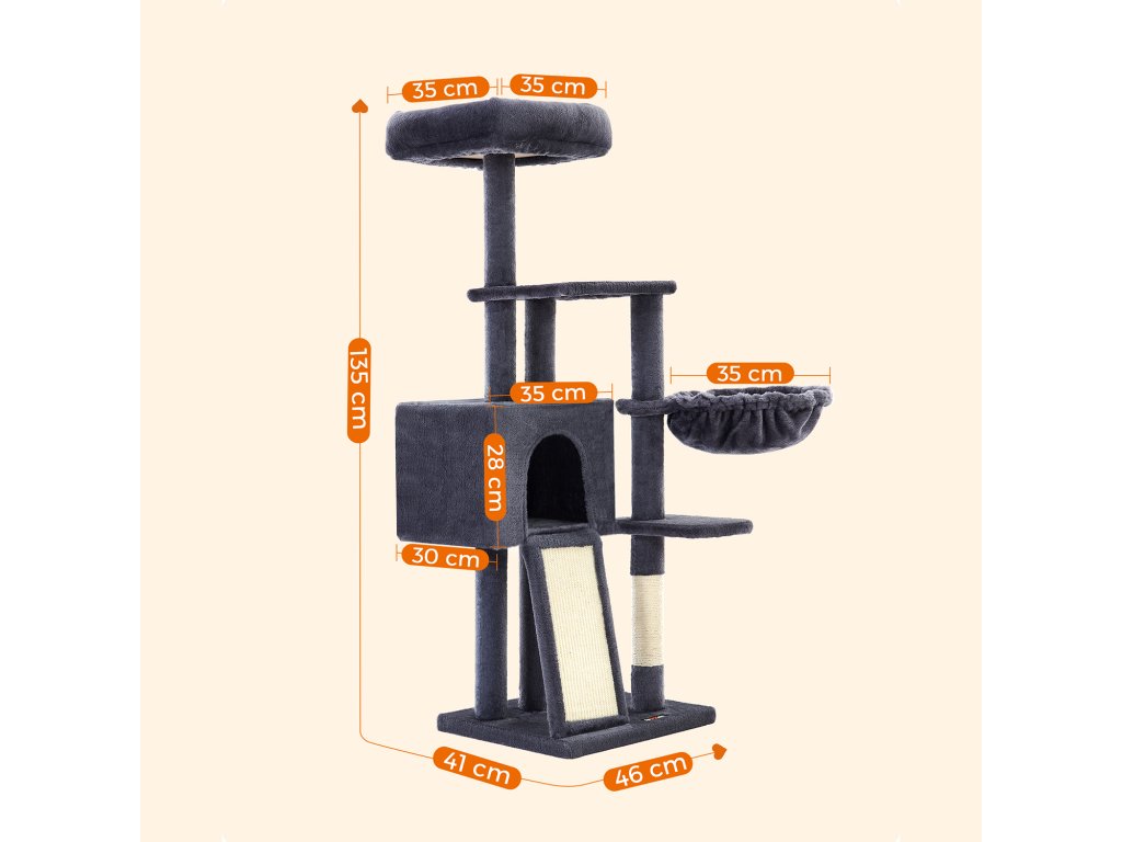 4 úrovně zábavy Lezení, spaní, hlídání.. tento 135 cm vysoký víceúrovňový kočičí strom nabízí kočkám různé možnosti hraní a díky víceúrovňové konstrukci je pro koťata a starší kočky snazší na něj vylézt.Stabilní, bezpečný, chráněný: Tento kočičí strom je díky vysoce kvalitní dřevotřískové desce, zesílené základně a ochraně proti překlopení stabilní a bezpečný a je vhodný až pro 3 velké kočky (každá max. 7 kg) pro hraní.Snímatelné kryty, které se snadno čistí: Kryt horní tyče pro kočky je odnímatelný pro snadné čištění (tip: ruční praní), takže můžete snadno udržovat prostor svého malého přítele hygienický.Všestranné pohodlí Kočičí věž je vystlaná plyšem, aby se vaši čtyřnozí přátelé cítili pohodlně kdekoli. Polstrované úzké bidýlko, plyšová jeskyně a měkký košík nabízejí více pohodlí a možností pro vrnění, dávkování a odpočinek.Chrání vaši pohovku Díky škrabadlu 2 v 1 a škrabací rampě umožňuje toto škrabadlo vašemu kočičímu příteli škrábat podle potřeby a chrání vaši pohovku před poškozením.| Kategorie: | Škrabadla pro kočky |