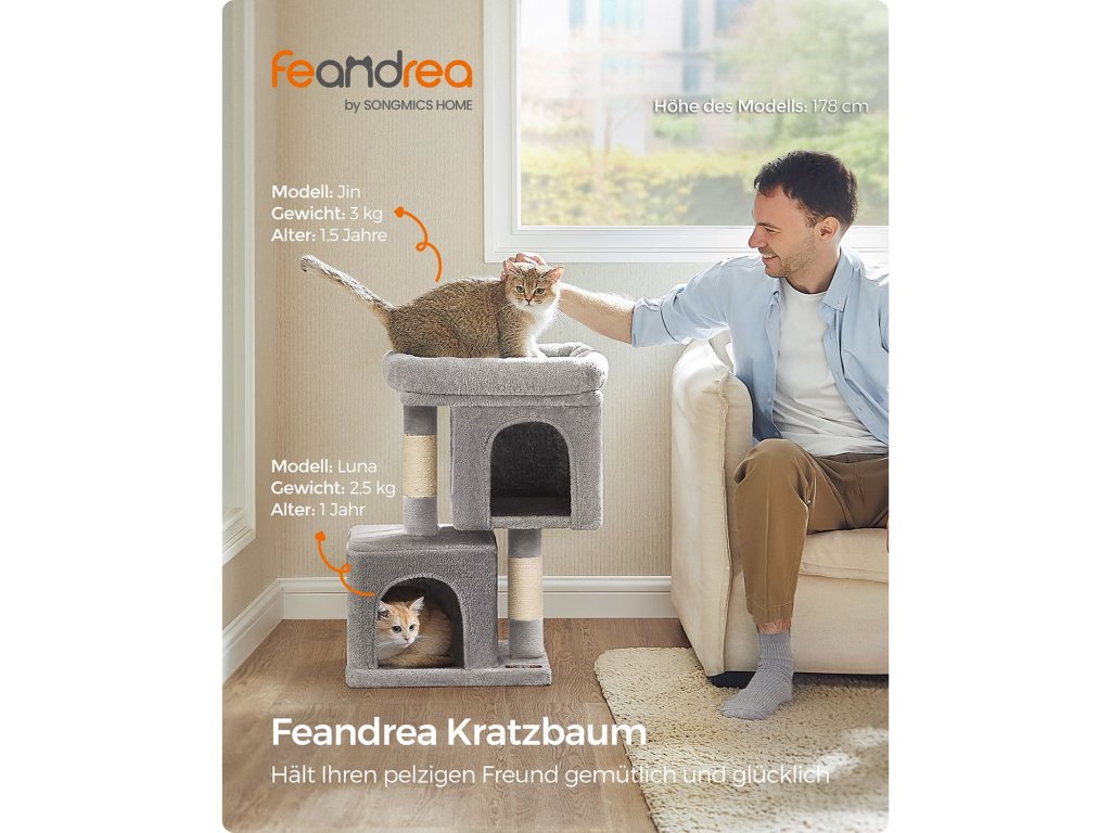 Velké bidýlko Tento malý kočičí strom je vybaven velkým bidýlkem o rozměrech 40 x 30 cm s dobře polstrovanými vyvýšenými okraji, které nabízí prostorný prostor, aby se vaše kotě mohlo plně natáhnout a pohodlně odpočívat. [2 jeskyně pro kočky] Horní dvoudveřová jeskyně nabízí široký výhled a snadný přístup. Spodní jeskyně s jedněmi dveřmi je klidným úkrytem pro spáče, kteří si zde mohou zdřímnout, a je také skvělá pro koťata, která se teprve učí skákat. [Lezení. Škrábnutí. Relax. Vše v jednom] Víceúrovňová konstrukce umožňuje koťatům snadno vylézt nahoru a dolů. 2 škrabadla odpovídají přirozeným instinktům koťat. Horní hrazdička je skvělá pro výhled z okna. 2 jeskyně jim umožňují pohodlně relaxovat a načerpat nové síly [Snadná montáž] Díky zjednodušené konstrukci můžete tuto věž pro kočky v interiéru postavit sami v několika málo krocích! [Robustní, stabilní, bezpečná] Robustní dřevotřísková deska pro dlouhou životnost, velká základna pro stabilitu a sada proti převrácení pro bezpečnost - tento domek pro kočky nabízí bezpečné hřiště pro hraní vašich chlupatých přátel.| Kategorie: | Škrabadla pro kočky |