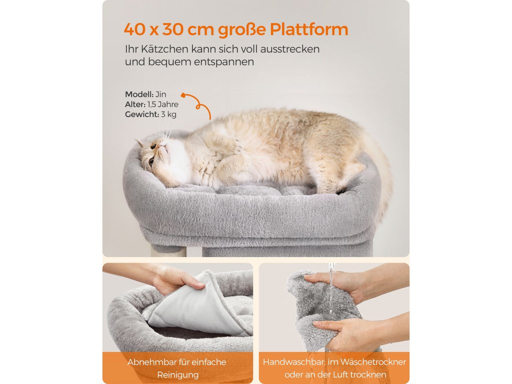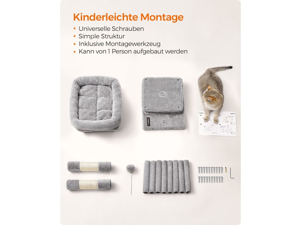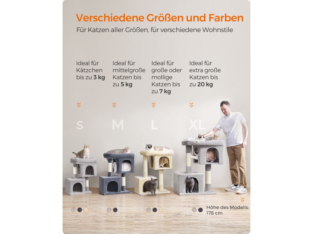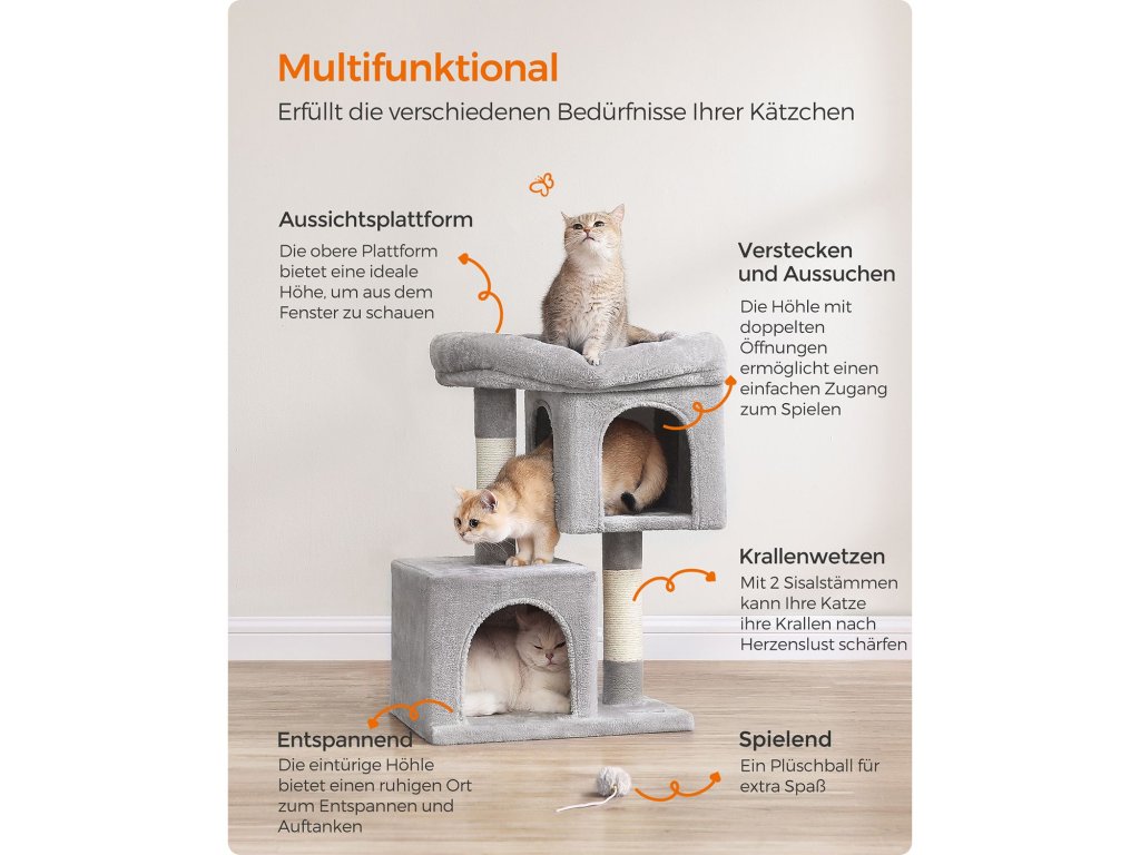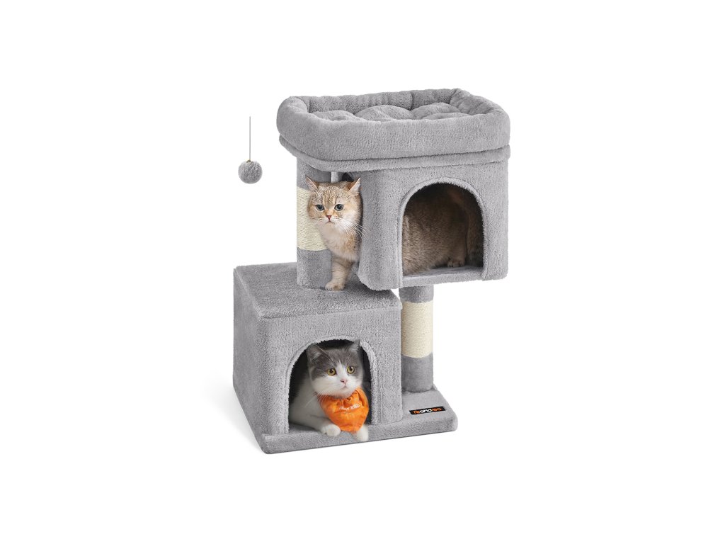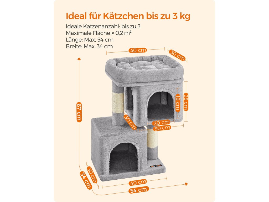 Strom pro kočky, 67 cm věž pro kočky, S, kotec pro koťata do 3 kg, velké kočičí bidýlko, 2 kočičí jeskyně, škrabadlo, světle šedá.