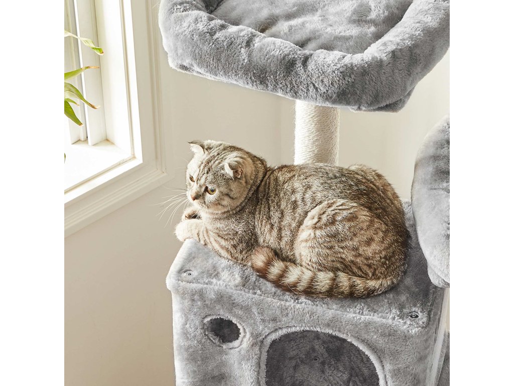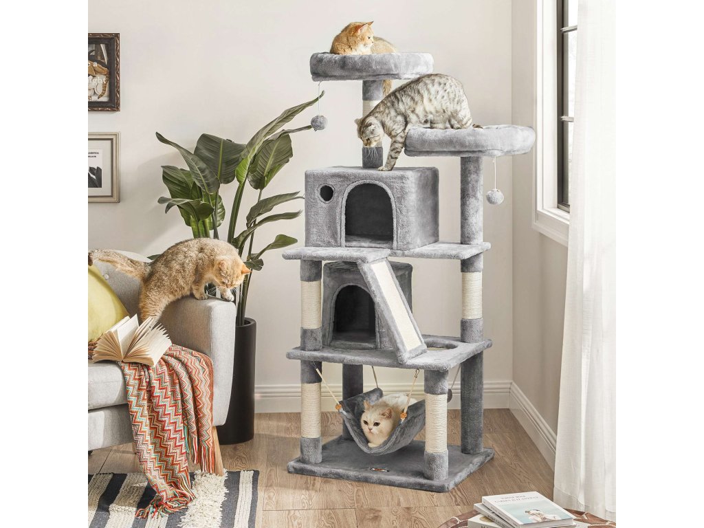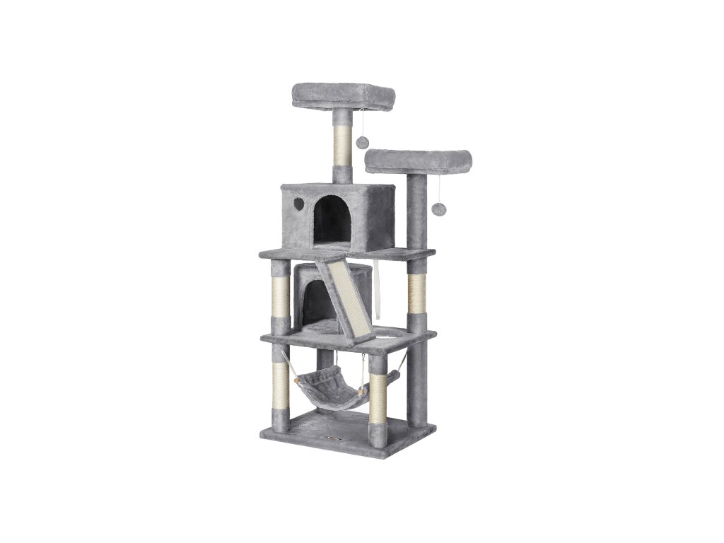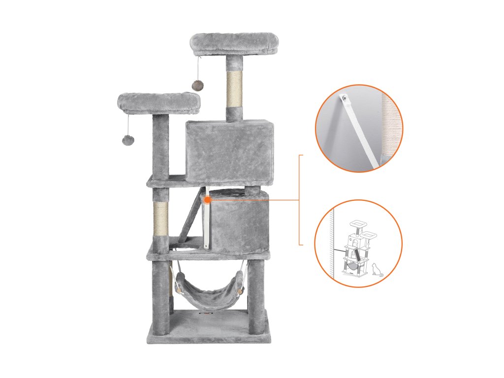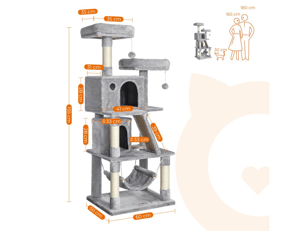 Strom pro kočky, kočičí domek se 2 jeskyněmi, 155 cm, světle šedá.