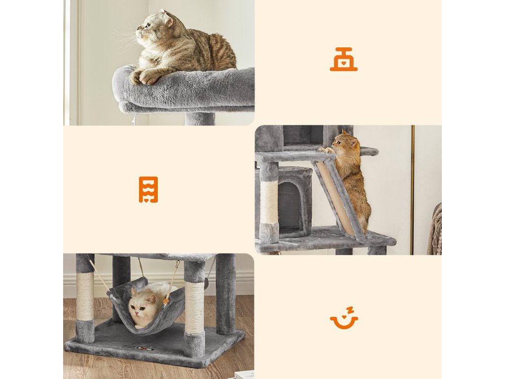 I když jste pryč... Vaše kočka se nenudí! Odpočívejte, protahujte se, šplhejte nebo si hrajte... váš malý chlupáč si na tomto centru pro kočky užije spoustu zábavy, i když budete pracovně mimo domov. Mimochodem, plyšový povrch je stejně měkký jako vaše mazlení!.