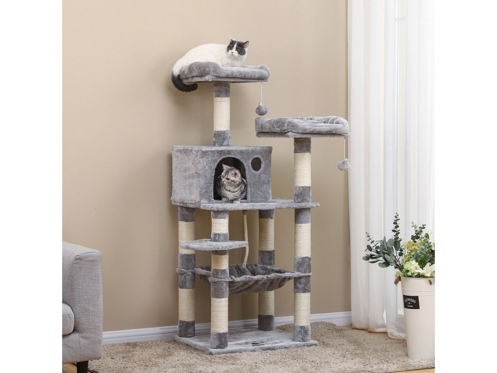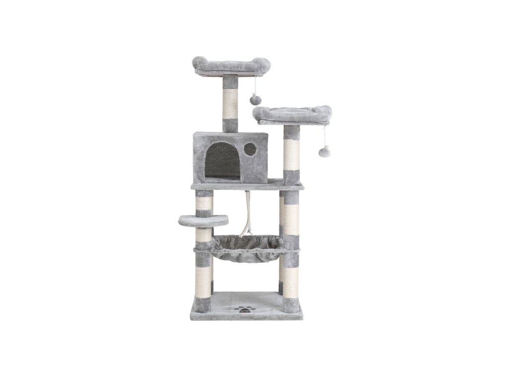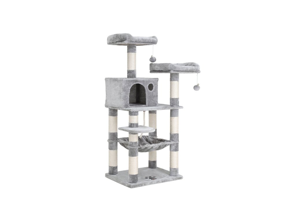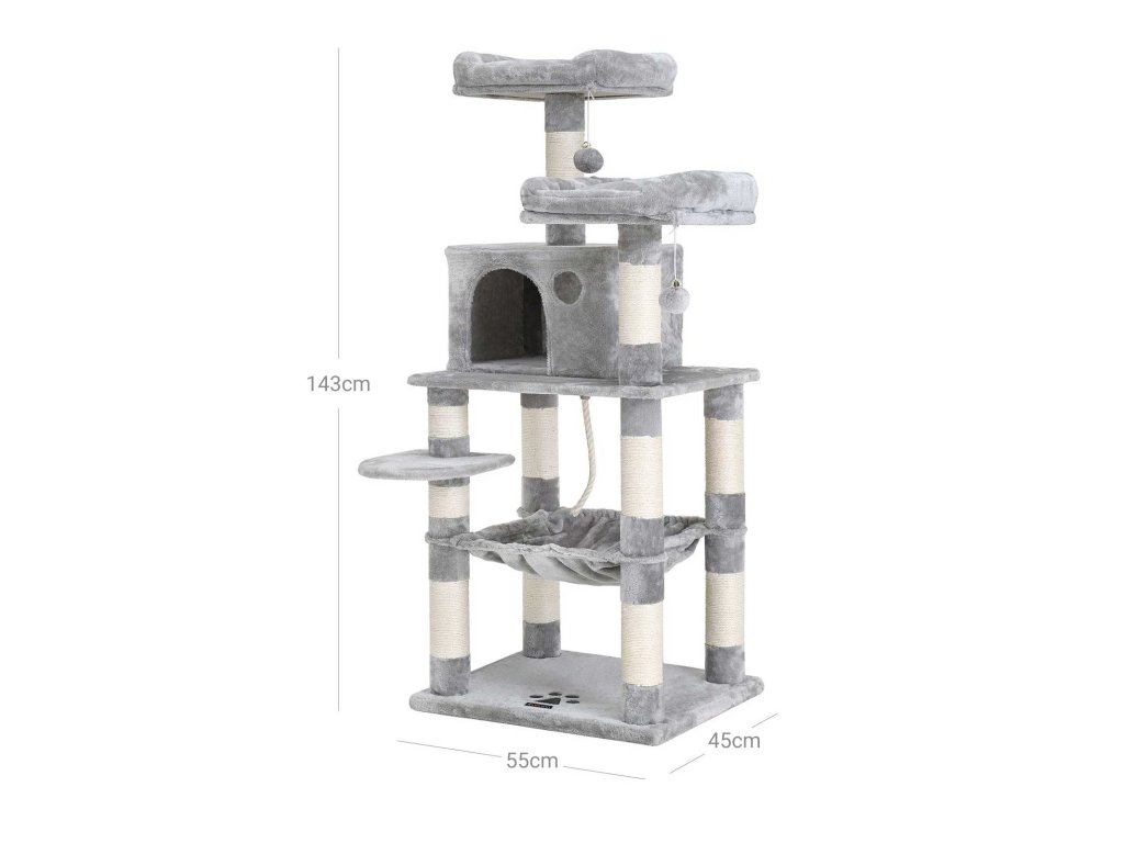 Strom pro kočky, stabilní věž pro kočky, 2 plyšová bidýlka, 143 cm, světle šedá.
