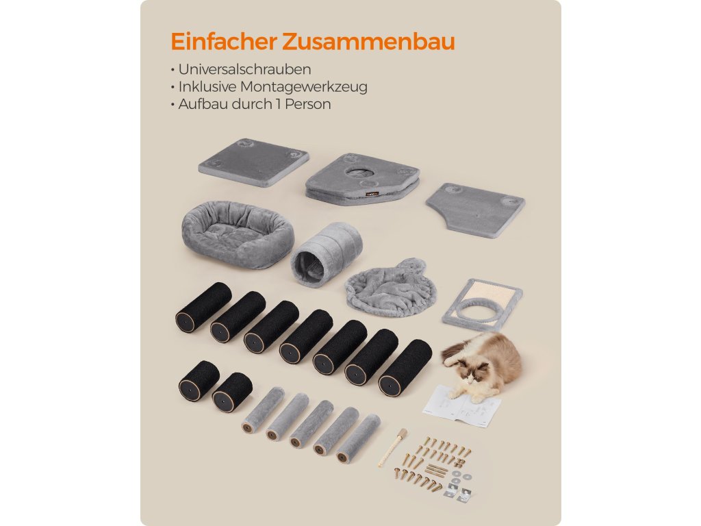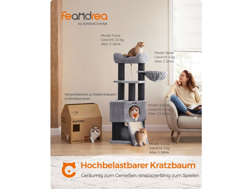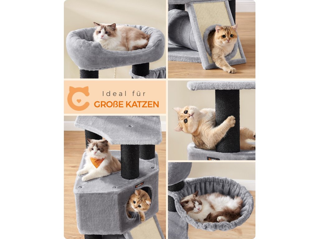 Prostorná kočičí nemovitost hledá nového majitele: Zařízená extra velkým plyšovým bidýlkem, prostornou jeskyní a hlubokým lehátkem je vysněným domovem každého domácího tygra.Dětské hřiště v prvním patře: Kromě pohodlných míst k odpočinku v horní části škrabacího stromu se dole nachází vzrušující dětské hřiště se zábavnou škrabací deskou a tunelem.Skalní ráj: Ať už máte doma svalnatou kočku plemene Ragdoll nebo velkou kočku Savannah, rádi byste se svými malými umělci na hrazdě hráli na jistotu. Proto je tento kočičí strom vybaven dvouvrstvou základovou deskou a ochranou proti převrácení. Ještě silnější než dříve jsou sisalové sloupky, které navíc zajišťují maximální stabilitu (průměr: 11,3 cm).Měkké postele pro kočky: Po procházce po zahradě je pro každou kočku požehnáním odpočívat na nadýchaných rohožích plyšového pelíšku nebo mazlící jeskyně. Také extra hluboké lehátko nabízí nejvyšší pohodlí.| Kategorie: | Škrabadla pro kočky |