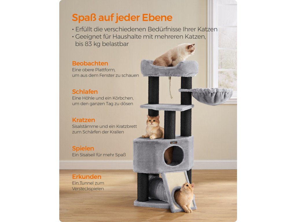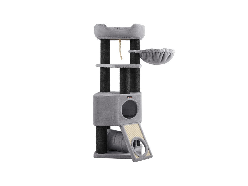 Strom pro kočky, velká věž pro kočky s nadýchaným plyšovým bidýlkem, kočičí domek s lehátkem s košem a jeskyní na mazlení, extra silné sloupky kompletně zabalené v černém sisalu, stabilní, pohodlné, světle šedé.