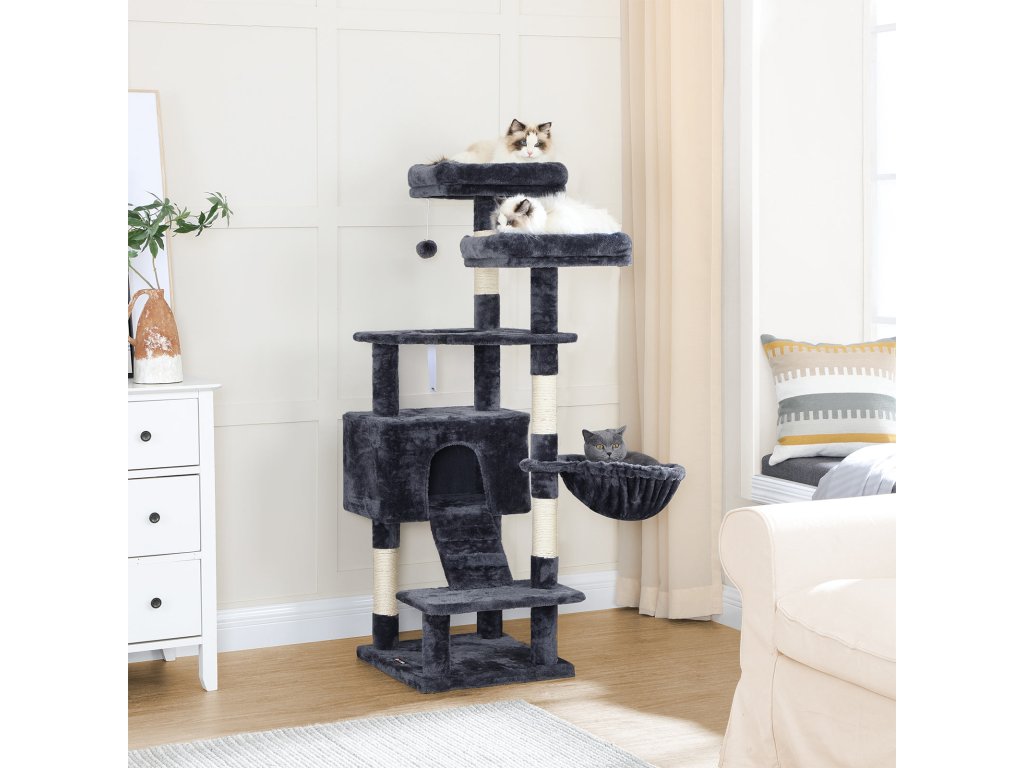 Strom pro kočky, věž pro kočky 142 cm, centrum aktivit pro kočky, kouřově šedá.