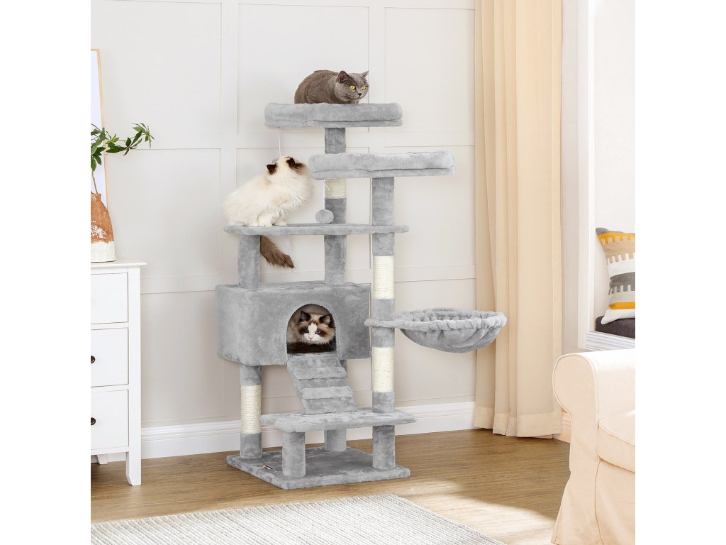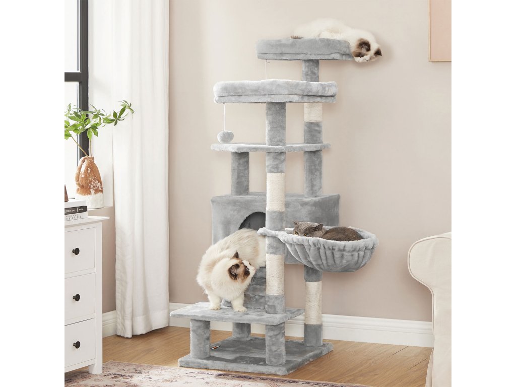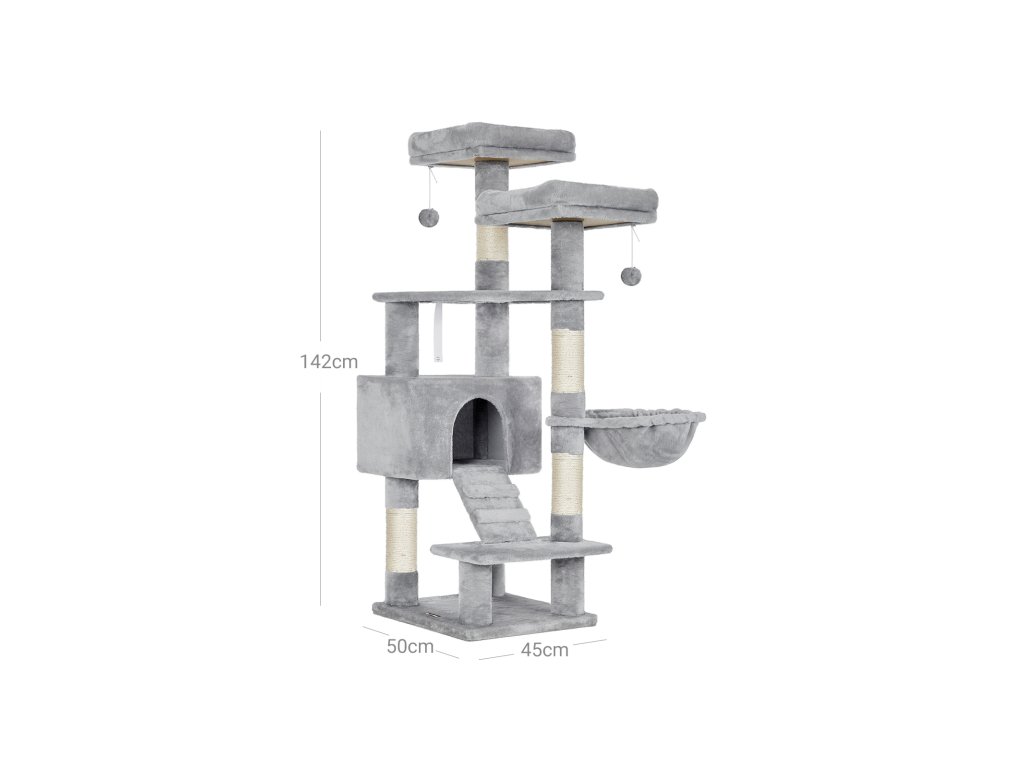 Strom pro kočky, věž pro kočky 142 cm, centrum aktivit pro kočky, světle šedá.