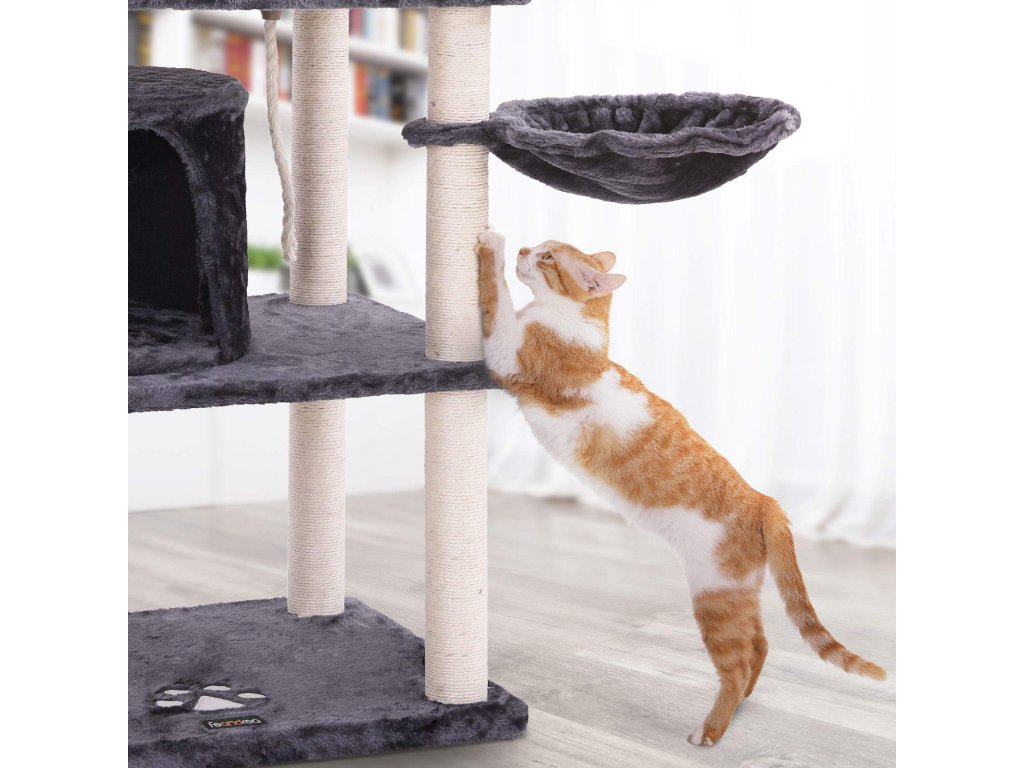 EXKLUZIVNÍ LUXUS PRO KOČKY: Tento domeček pro kočky se jistě stane jejich splněným snem: vaši kočičí přátelé potřebují vlastní útulný domov, kde si mohou hrát, zdřímnout si nebo skákat.RELAXAČNÍ MÍSTO SE VŠÍM VŠUDY: Dvoulůžkové apartmány s prostorným interiérem a plyšovým košem nabízejí luxusní zážitek ze spánku; horní bidýlka se zvýšeným okrajem umožňují kočce odpočívat na hlavě a zároveň hlídat dům;ŠKRABADLA POTAŽENÁ SISALEM: Vyztužené sloupky jsou po celém povrchu omotány přírodním sisalovým provazem, který umožňuje škrábání nehty a podporuje cvičení; tento kočičí strom je ideálním místem pro skákání vašich koček;STABILITA JE VŽDY PRIORITOU: Vyrobeno z dřevotřískových desek a zesíleno latěmi ve spodní části, aby byla zajištěna celková stabilita; součástí je kování proti převrácení pro dvojnásobnou bezpečnost.Udělejte kočkám radost: Rozmazlujte své kočky tímto škrabadlem, aby se necítily osamělé, když jste pryč, a nechte je hrát si a odpočívat v pohodlí.| Kategorie: | Škrabadla pro kočky |