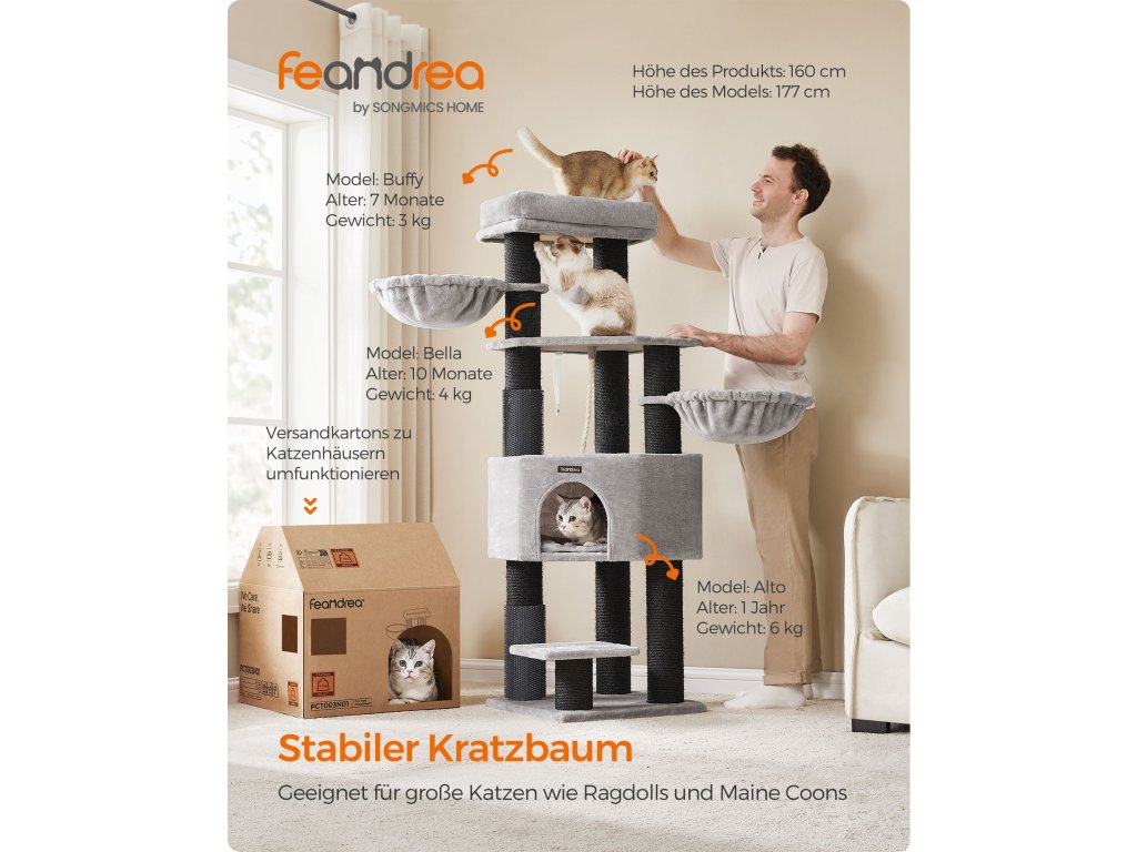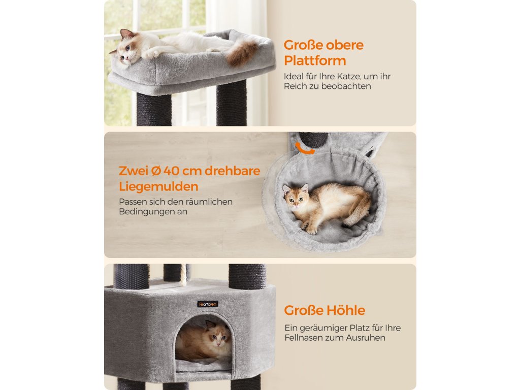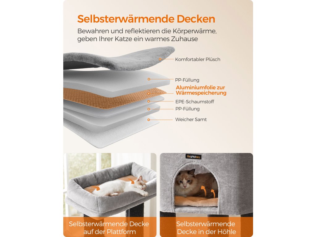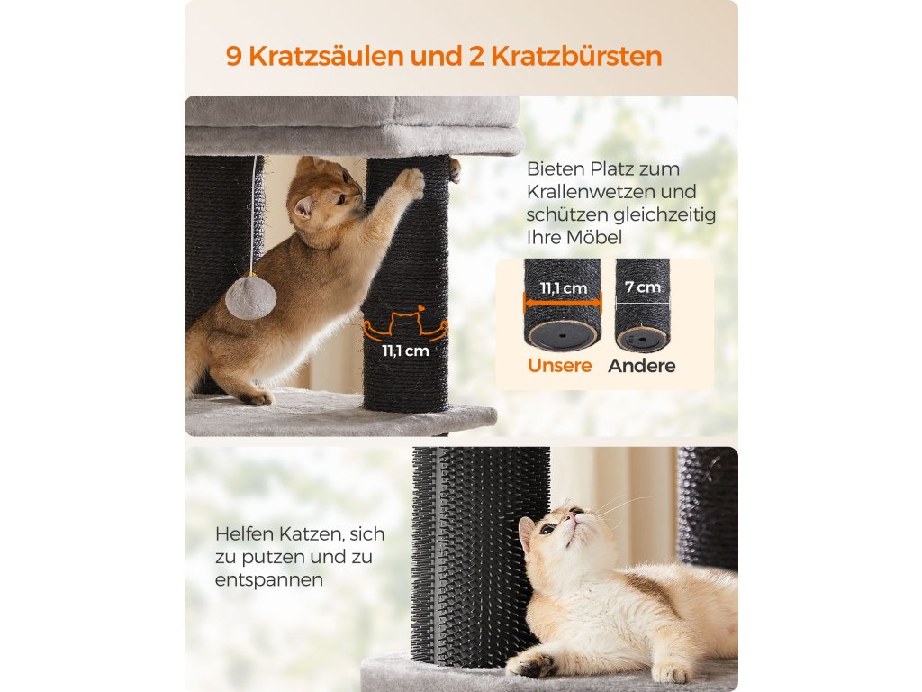 Samohřejivé polštářky Horní kočičí bidýlko a jeskyně jsou vybaveny pohodlnými polštářky, které absorbují, zadržují a odrážejí tělesné teplo vaší kočky. poskytují vašim chlupáčům tolik potřebné teplo a udržují je v útulném a příjemném prostředí.9 tlustých škrabadel Kočky milují škrábání. S 9 odolnými škrábacími sloupky, které jsou obaleny 5,6 mm průměrem. Díky silným sisalovým provazům se mohou s tímto kočičím stromem do sytosti poškrábat a nechat vaši pohovku jít!.2 kočičí samoopalovače Ať už jde o snadno dostupné potírání nebo rychlé zklidnění svědění či podráždění, tyto kočičí samoopalovače vám usnadní péči, i když jste pryč.Snadné čištění Kryt a podložka kočičího bidýlka v jeskyni jsou odnímatelné a omyvatelné pro snadné čištění, takže je snadné udržovat hygienický životní prostor pro vaše kočky.Stabilní a bezpečná Tato věž pro kočky s vyztuženou základnou o rozměrech 50 x 50 cm, sloupky o průměru 11,1 cm a sadou proti převrácení pro větší bezpečnost zajišťuje bezpečnost vašich koček. Nebojte se je nechat skákat nahoru a dolů.| Kategorie: | Škrabadla pro kočky |