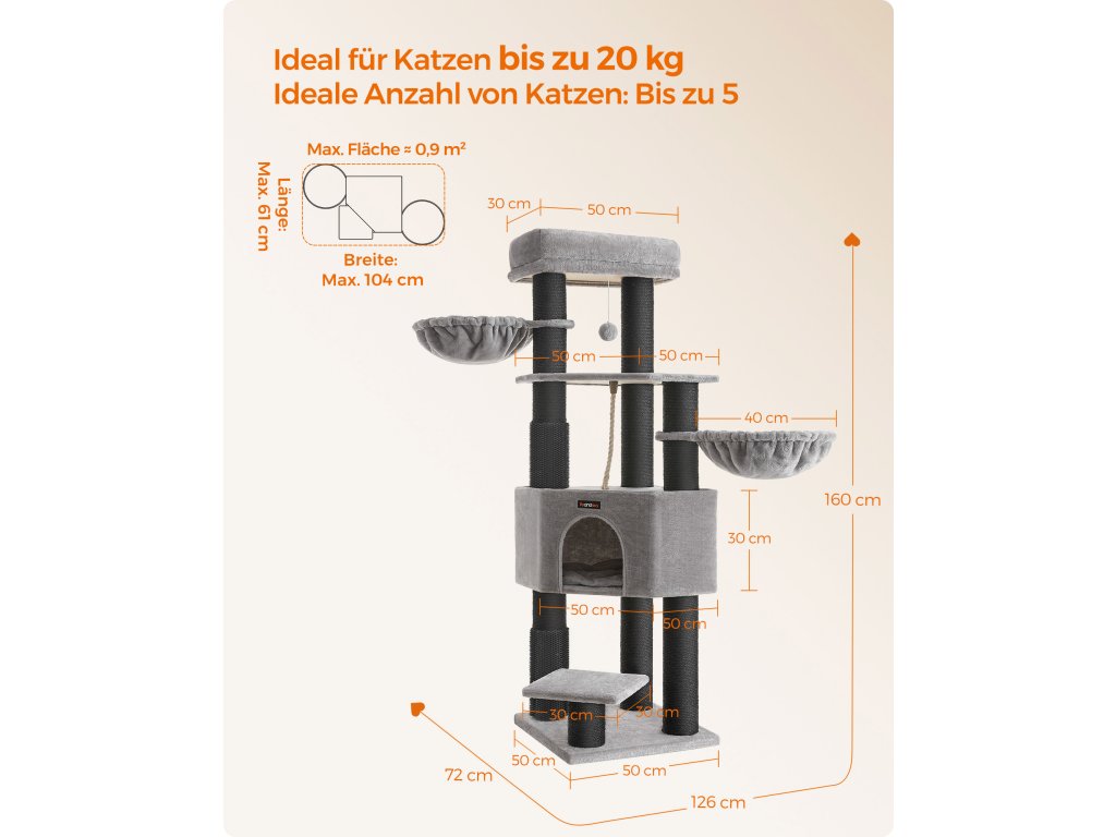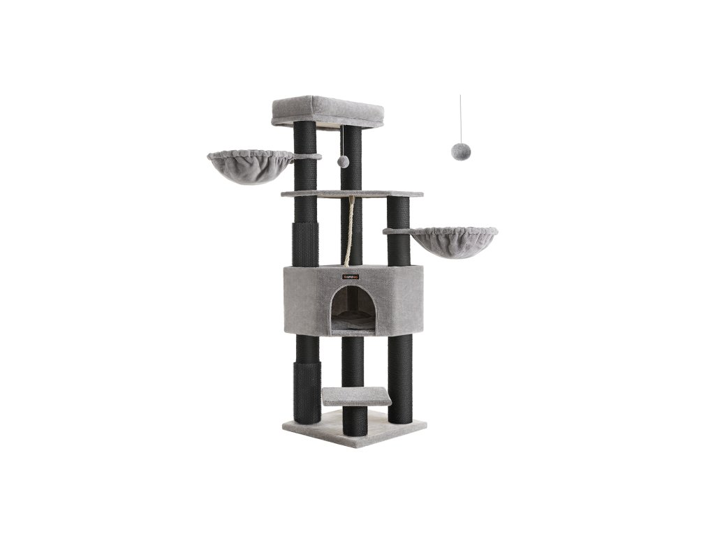 Strom pro velké kočky, odolná věž pro kočky se samohřejivými podložkami, 2 samohubkami, 9 škrabadly, velkým bidlem, jeskyní, koši, 50 x 50 x 160 cm, holubičí šedá a černá.