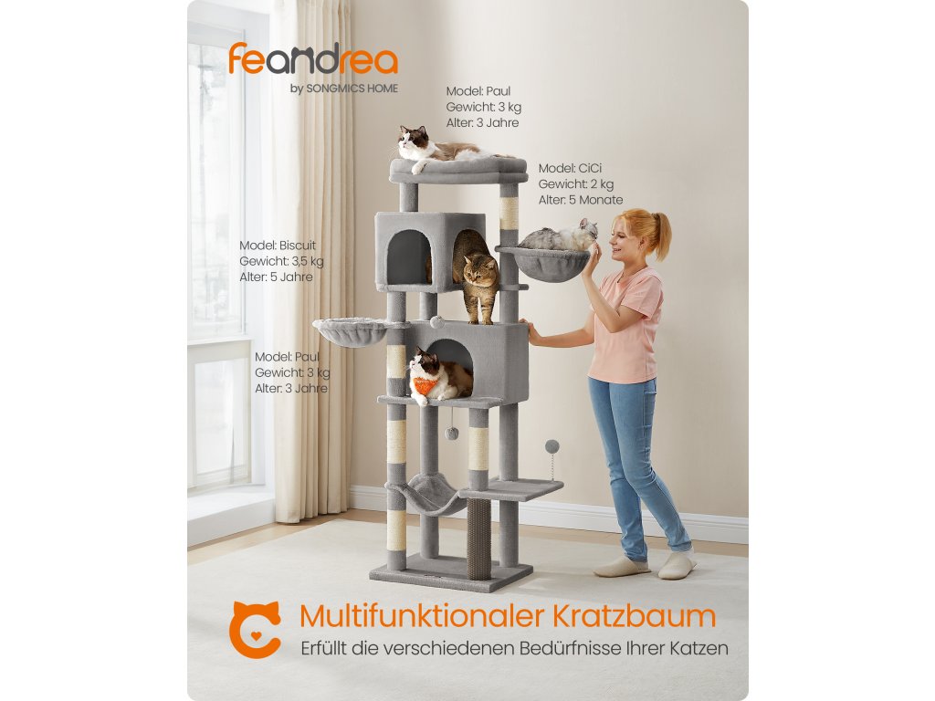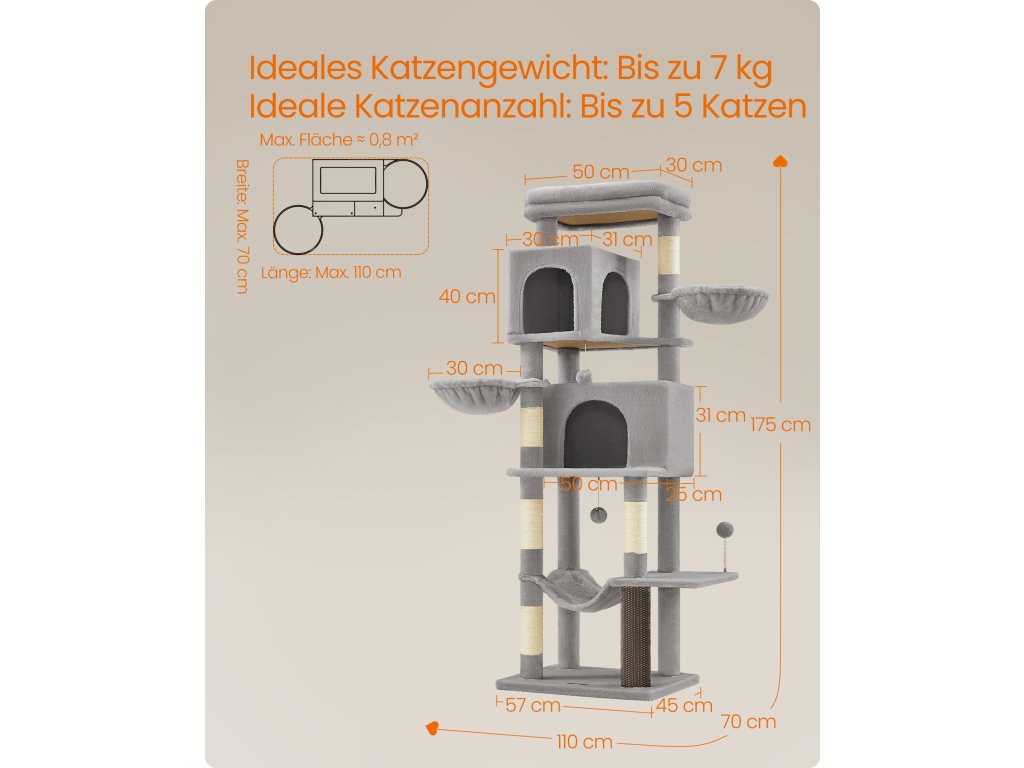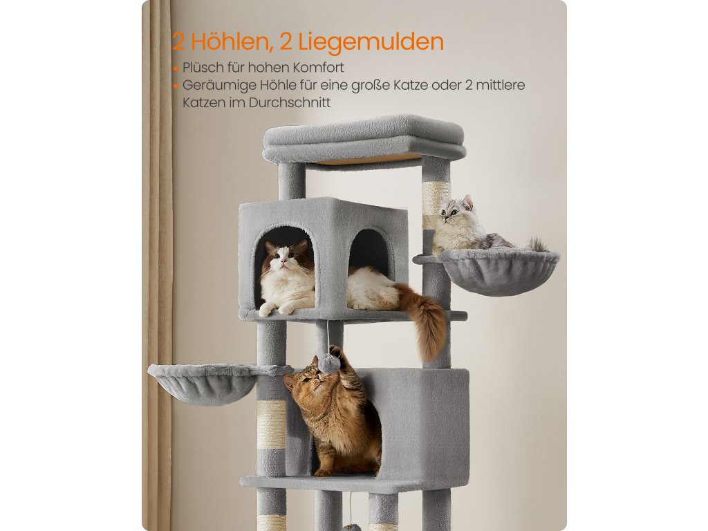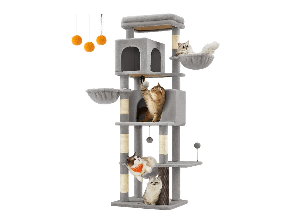 Velký kočičí strom, 175 cm vysoká věž pro kočky, víceúrovňový kočičí domek se 2 jeskyněmi, 2 koši, 5 škrabadly, samohubkou, bidýlkem, houpací sítí, pro kočky chované uvnitř, holubičí šedá.