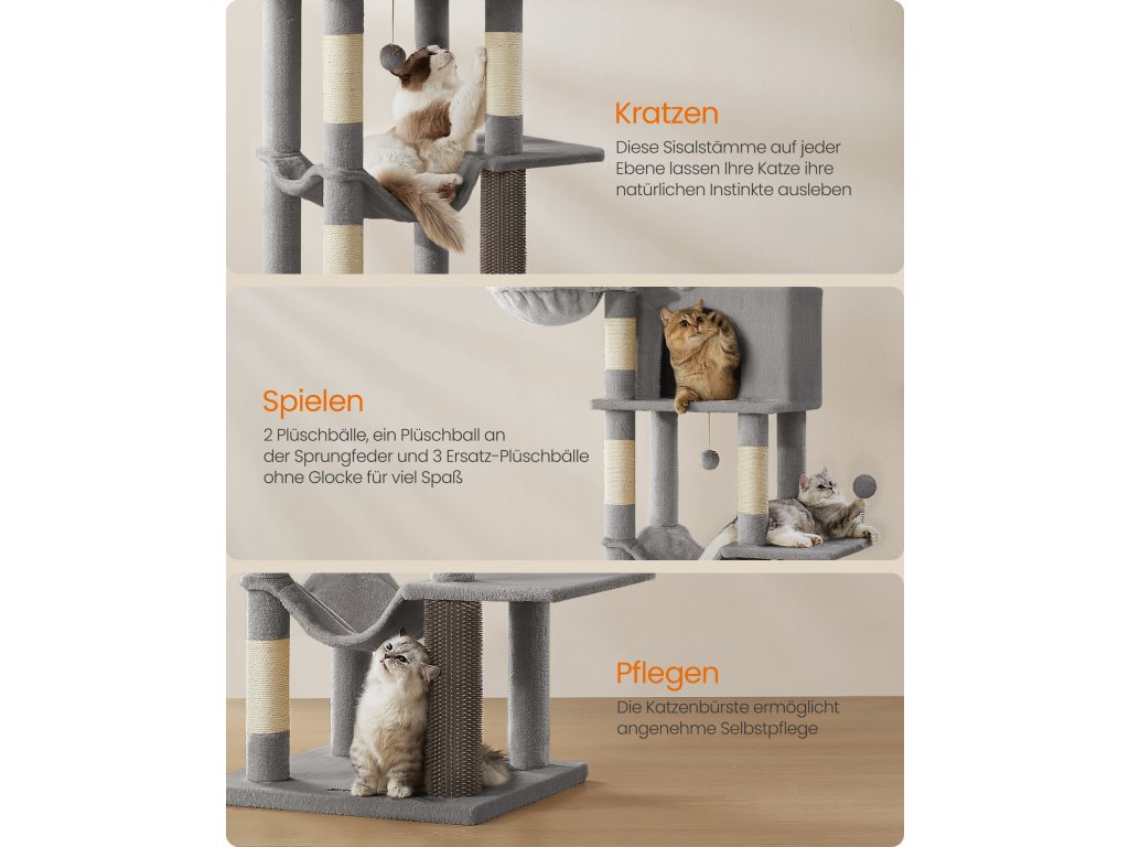 【NATURE AT THEIR PAWS】Dovolte svým kočkám, aby se poškrábaly díky sisalovým sloupkům na všech úrovních. Mohou se protáhnout, drápat a cítit se jako král džungle. Navíc je v základně umístěn samoopalovací strojek, který zajišťuje blaženou péči o sebe a uspokojivé laskání.