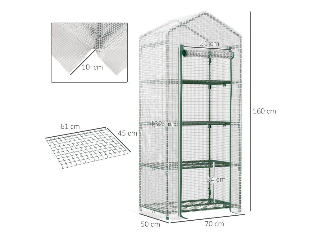 S policemi na rostliny: Polytunelový skleník je vybaven 4 policemi (výška každé police: 34 cm, každá s maximální nosností 15 kg), takže si můžete rostliny uspořádat prostorově úsporným a přehledným způsobem.