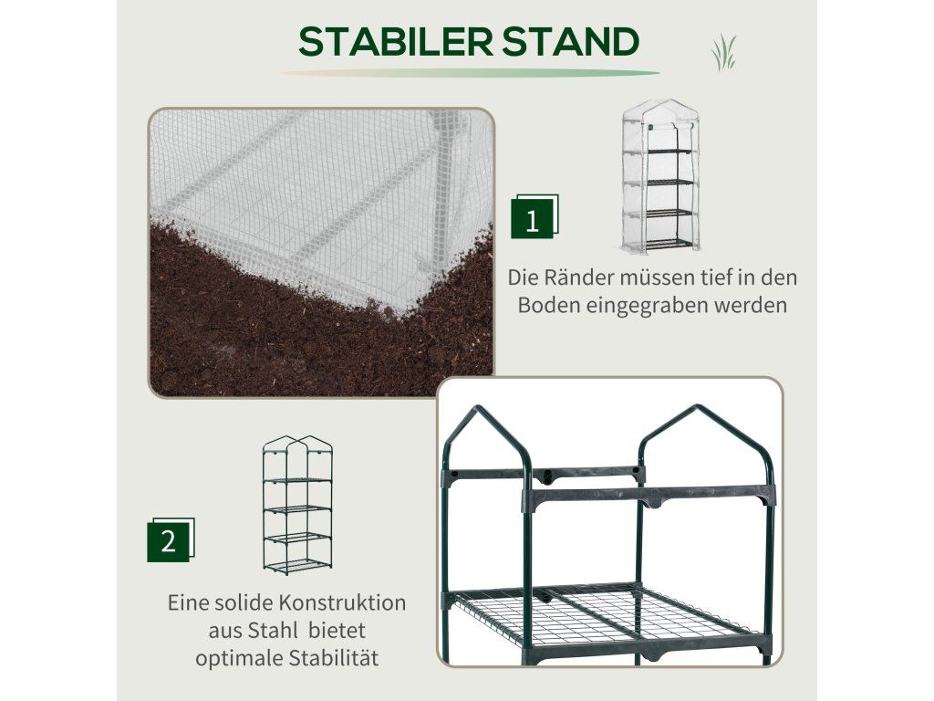 Stabilní konstrukce: Rám skleníku je vyroben z práškově lakovaných ocelových trubek. Robustní základní rám zajišťuje extra stabilitu.
