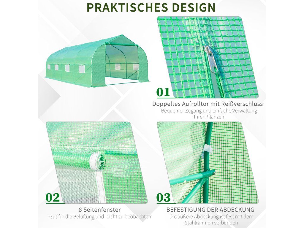 Rám z odolné oceli: Vyrobeno z odolného pozinkovaného ocelového rámu pro pevnost a stabilitu, odolného vůči rzi, korozi, odštěpování a loupání. Další šikmé podpěrné tyče poskytují extra stabilitu a robustnější skleník.