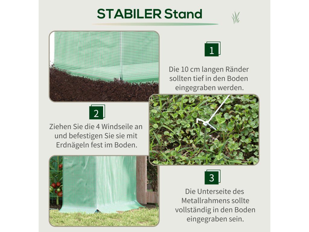 ✔ Extra dlouhé okraje krytu skleníku lze zatížit nebo zahrabat.