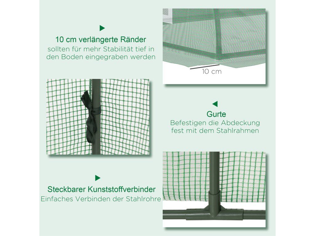 ✔ Zemní tyče a 10 cm prodloužené okraje pomáhají upevnit skleník k zemi.