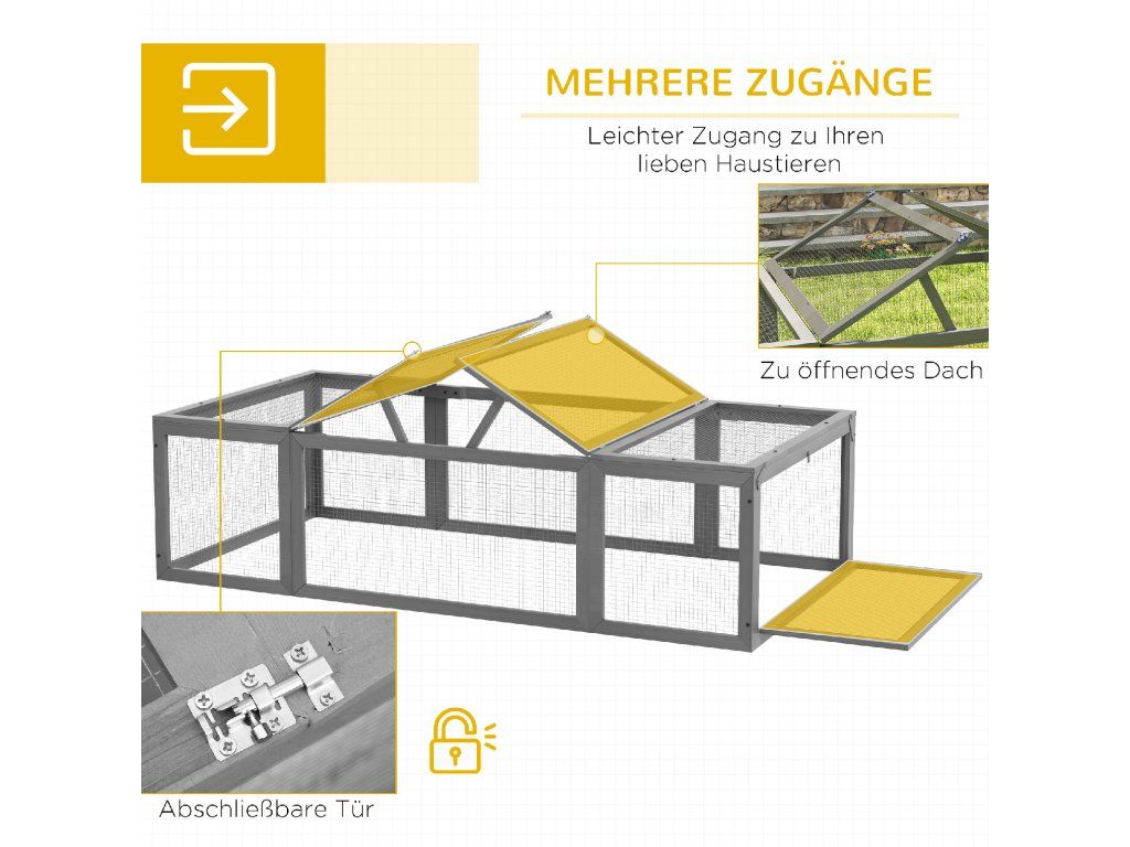 Střecha na výklopných pantech: Pro snadné krmení a čištění lze střechu a boční síťovaný panel snadno otevřít. Králíkovna může být také použita v kombinaci s králíkárnou pro trvalý přístup ven.