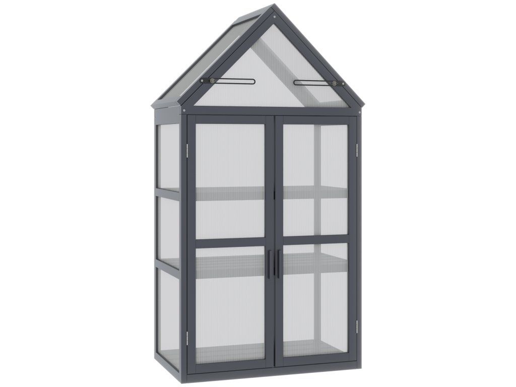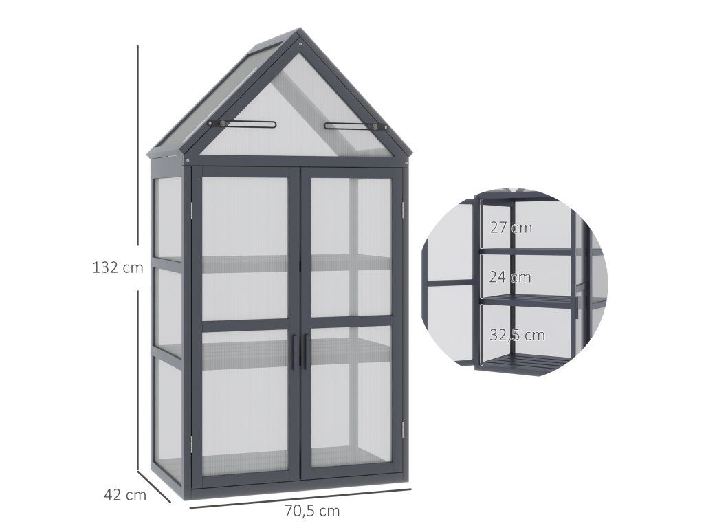 S tímto kompaktním skleníkem můžete pěstovat květiny, bylinky a další rostliny téměř kdekoli. Má robustní dřevěný rám a robustní pouzdro z průhledných polykarbonátových panelů, které zajišťují, že vaše rostliny budou mít dostatek slunečního světla a budou růst v konzistentní a zdravé teplotě. Tři praktické police poskytují dostatek prostoru pro řadu rostlin, zatímco dvě výklopná střešní okna a dvojité dveře zajišťují vynikající větrání.