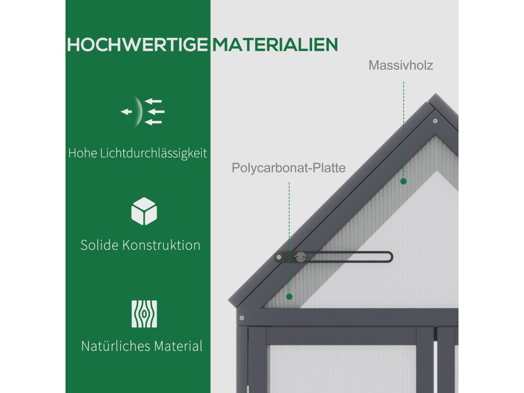 Dřevěný rám: Rám skleníku je vyroben z pevného dřeva a je opatřen povětrnostně odolným nátěrem, díky čemuž je ideální pro dlouhodobé venkovní použití.