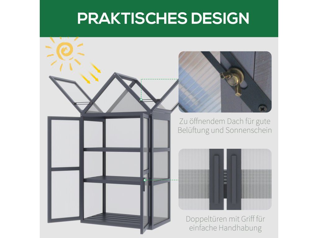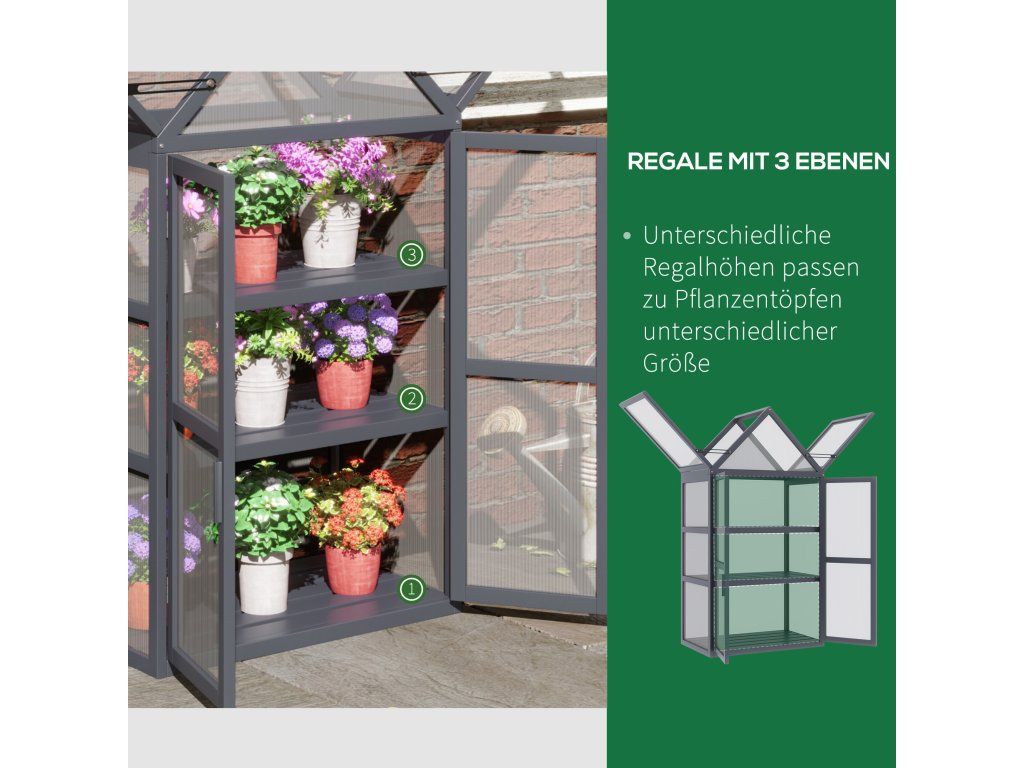3 police: Díky praktickým 3 policím nabízí tento mini skleník dostatek prostoru pro mnoho rostlin. Snadno si přineste nádech zeleně na terasu, balkon nebo do zahrady.