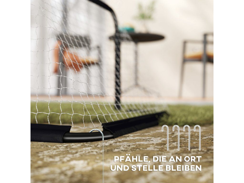 Snadná montáž: Čtyři kolíky umožňují rychlé zajištění branky. Černý pruh na síti usnadňuje vyrovnání.