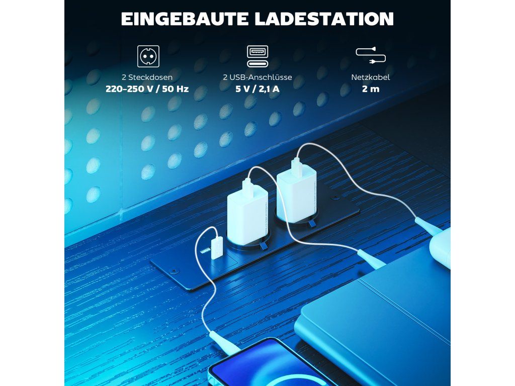 Nabíjecí stanice vše v jednom: Napájejte monitor, telefon a konzoli pomocí dvou AC zásuvek a dvou USB portů. Sedmibarevný LED pásek pod stojanem monitoru osvětluje vaši pracovní nebo herní plochu a vytváří tak herní atmosféru nebo prostředí pro lepší soustředění.