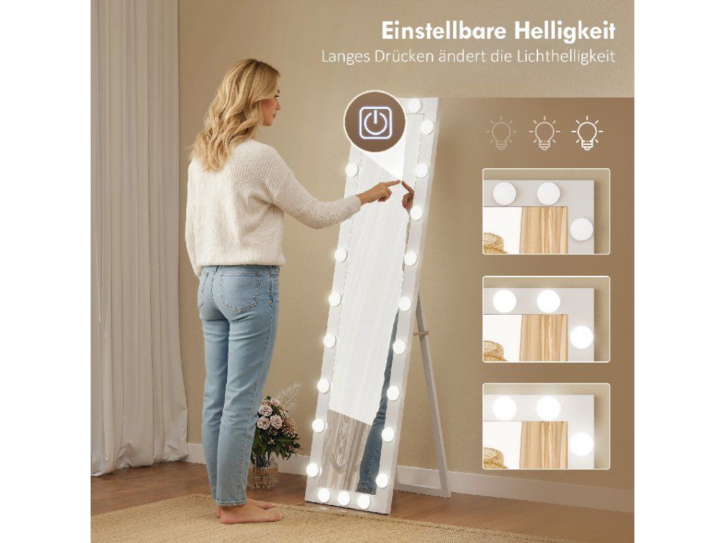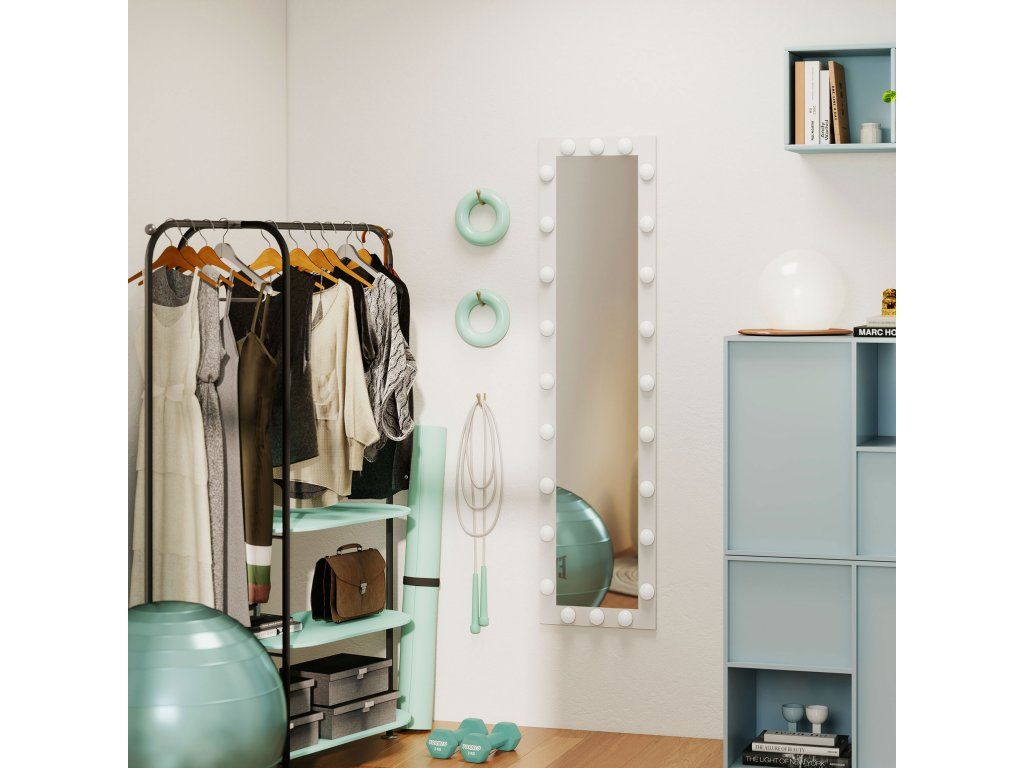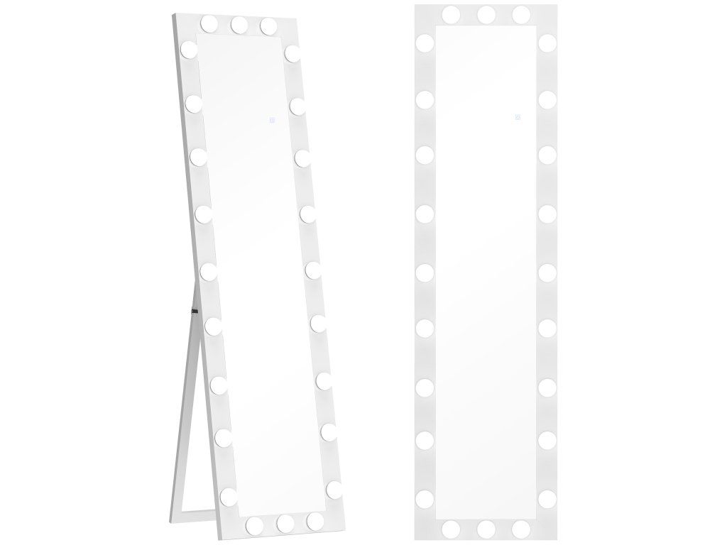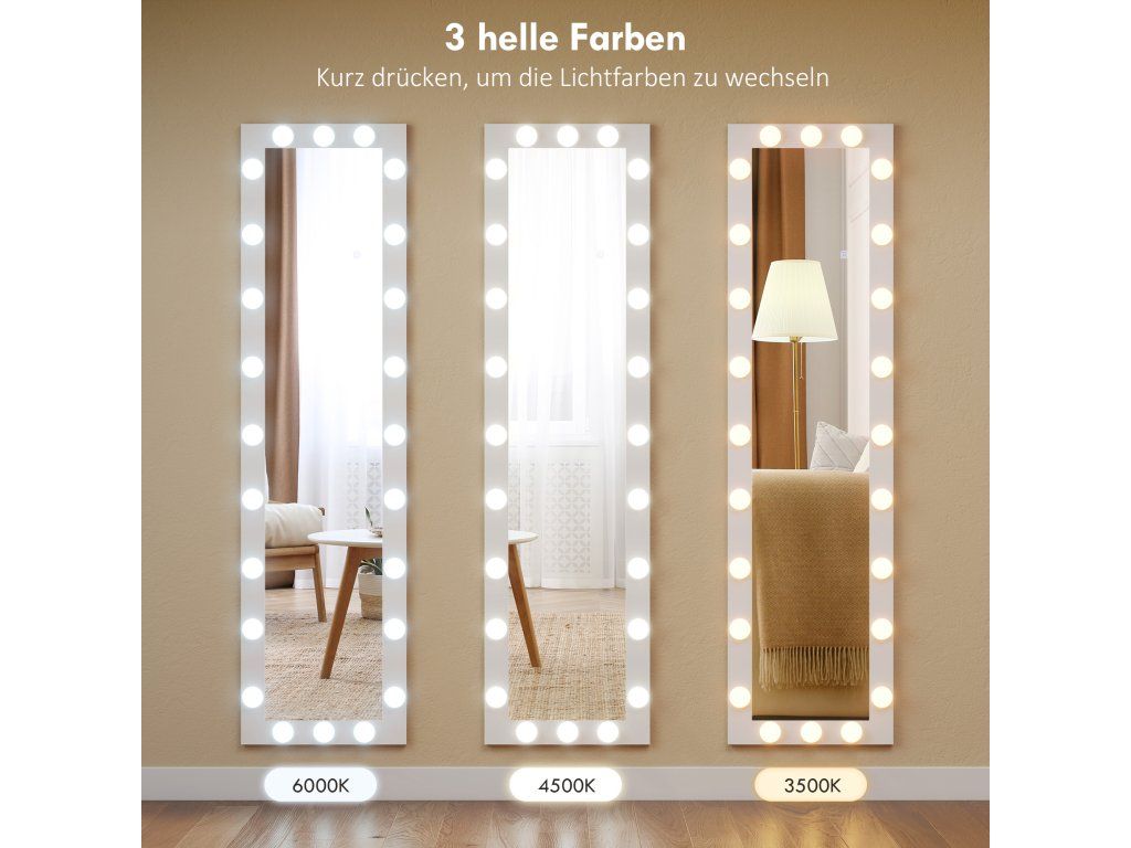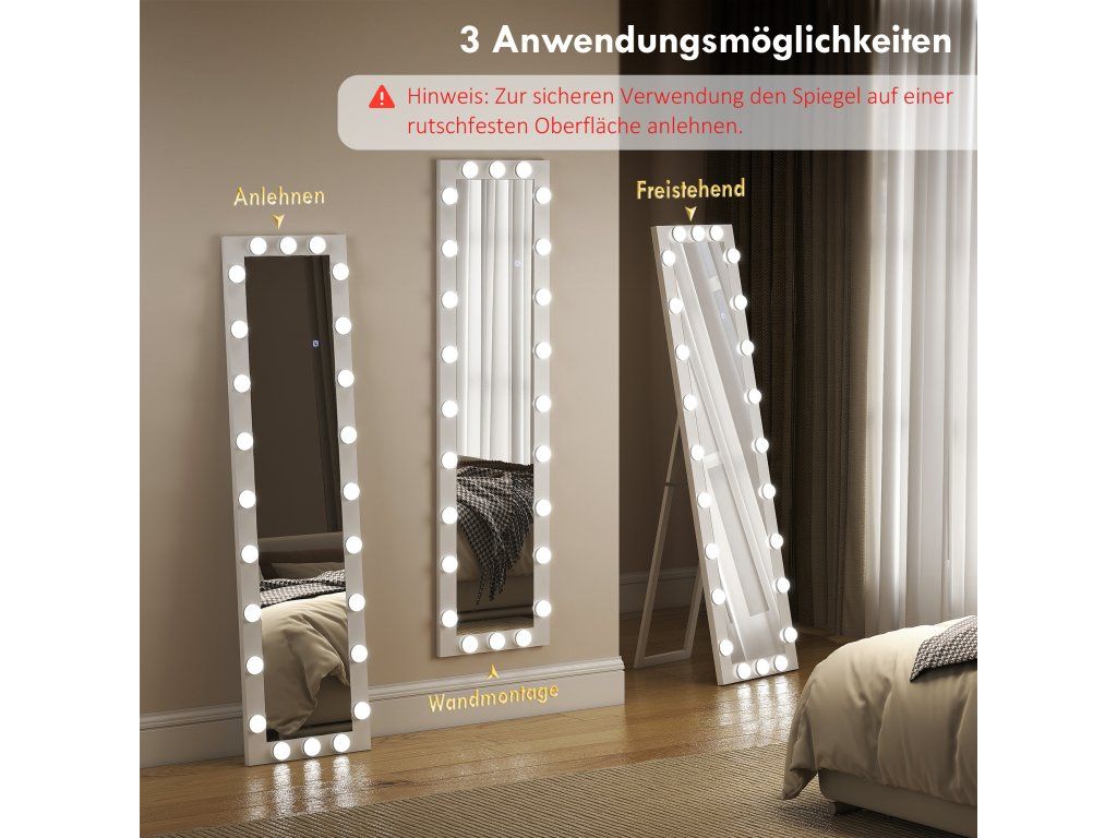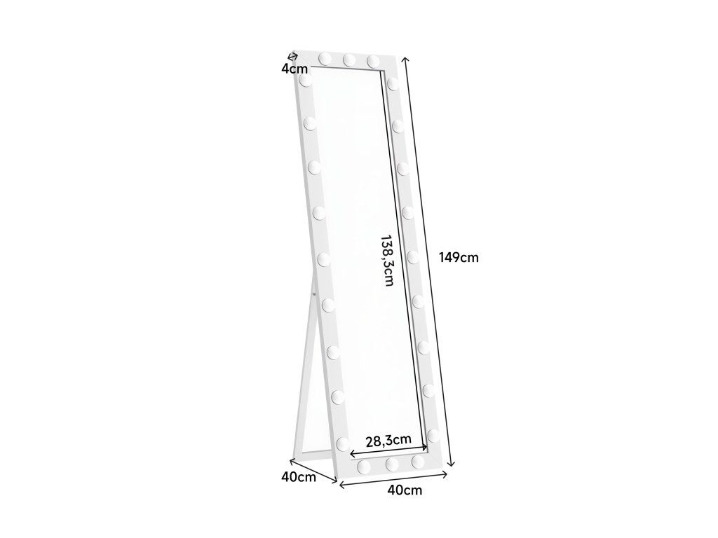 Pohled v celé délce: Toto stojící zrcadlo o rozměrech 150 x 40 cm poskytuje kompletní výhled od hlavy až k patě, ideální pro kontrolu vašeho outfitu. Elegantní bílý rám z MDF s 24 světly v hollywoodském stylu se perfektně začlení do ložnic, obývacích pokojů nebo šaten.
