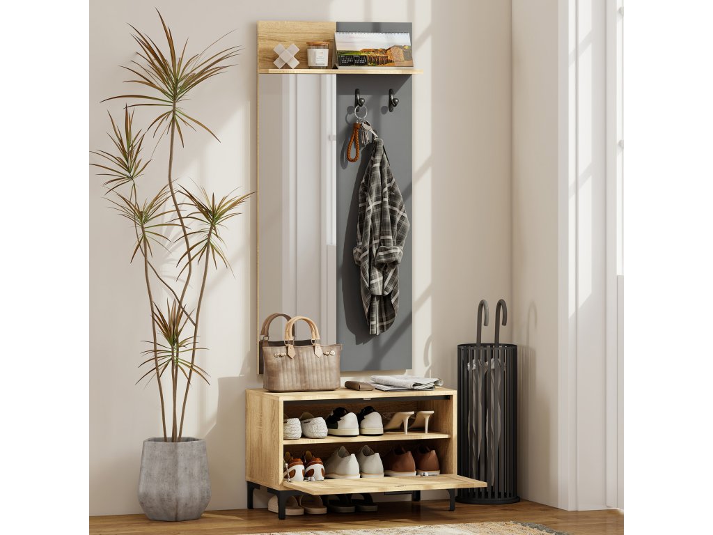 Trpíte nepořádkem v předsíni? Tento každodenní stres vám uleví šatní sada do předsíně: její inovativní dělený design vám umožňuje přizpůsobit si uspořádání. Šatní skříň do předsíně kombinuje zrcadlo, háčky a skládací botník, takže má vše své místo. Užijte si příjemnou a uklizenou předsíň s touto šatní skříní a botníkem, díky nimž bude každý příchod uvolněný a každý odchod snazší.
