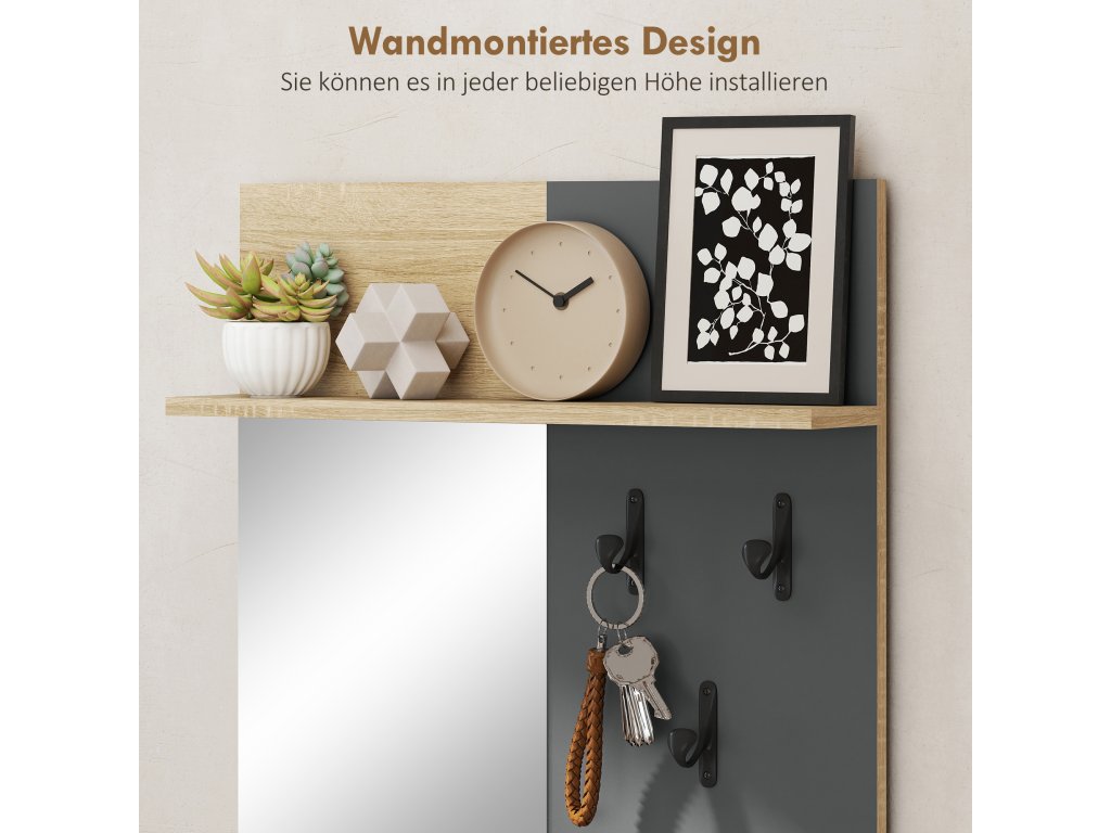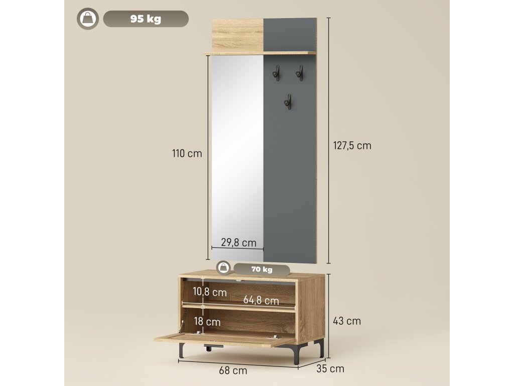 ✔ Tato šatní skříň do předsíně kombinuje zrcadlo, háčky, poličku, lavici a úložný prostor na boty.
