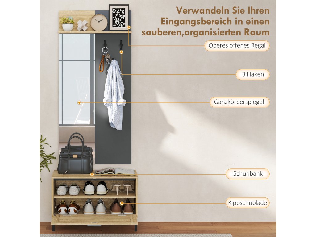 Design vše v 1: Tato všestranná sada šatních skříní do předsíně nabízí zrcadlo v celé délce, věšák na kabáty a botník, aby vaše vstupní hala zůstala uklizená a příjemná.