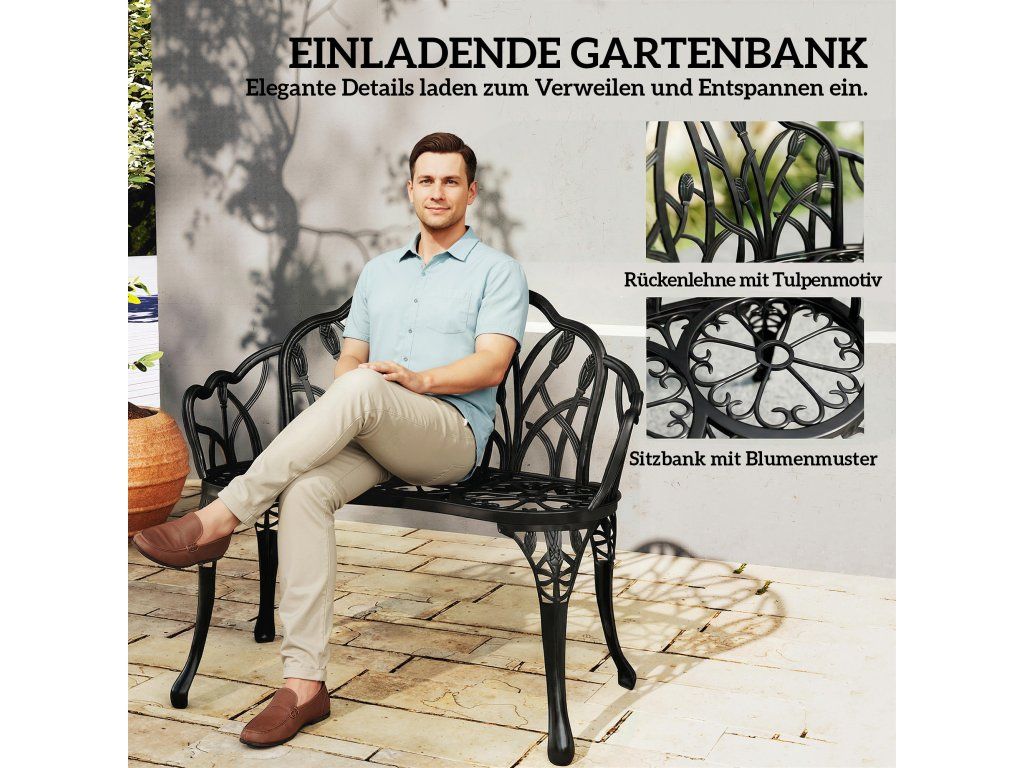 Řemeslné zpracování inspirované tulipány: S opěradlem ve tvaru tulipánu a třemi květinovými vzory na sedáku dodává tato zahradní lavice dekorativní vzhled Kouzlo a umělecký nádech vaší zahrady nebo terasy.