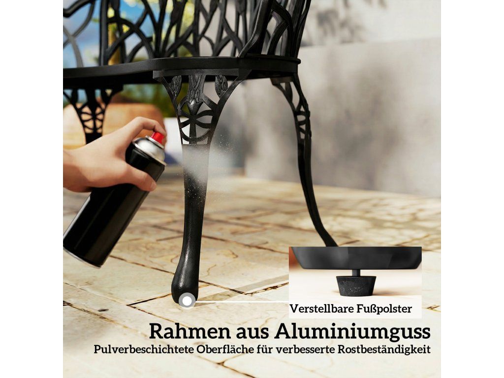Stabilní litý hliník: Tato venkovní lavička odolná proti korozi, vyrobená z lehkého, ale extrémně robustního rámu z litého hliníku s práškovým nástřikem, spolehlivě unese až 240 kg a nabízí stabilní základnu s nastavitelnými opěrkami nohou.