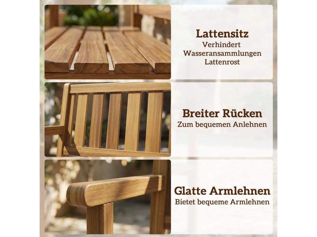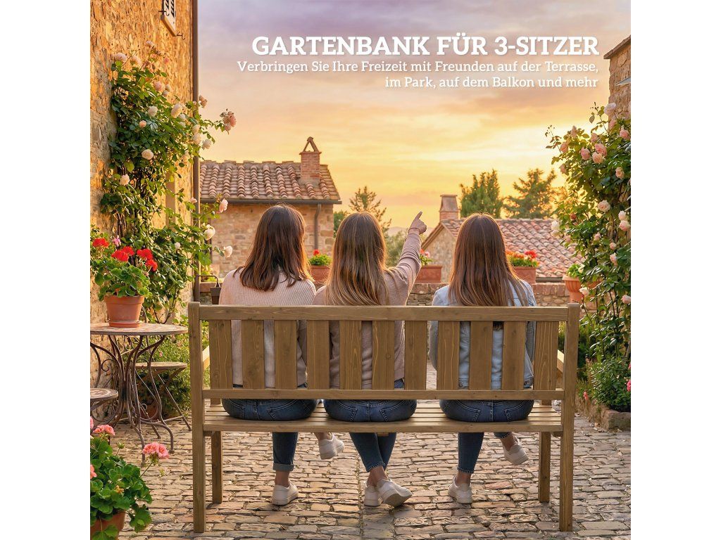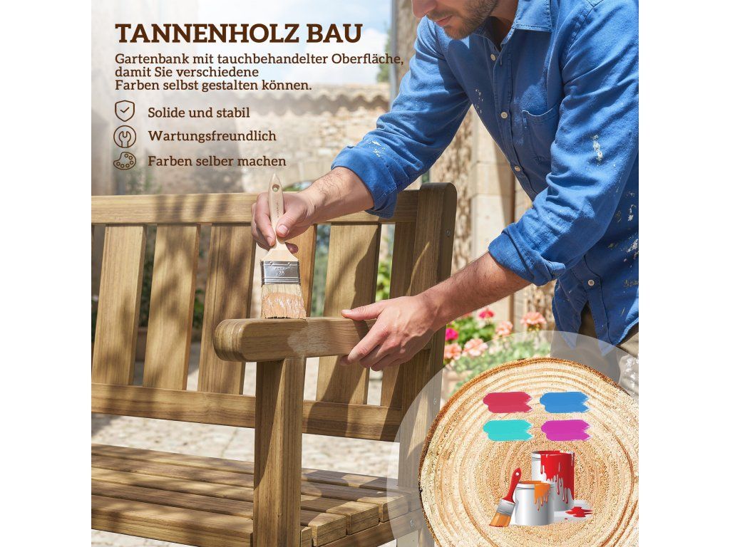 Masivní jedle dřevěná konstrukce: Zahradní lavice s tlustým dřevěným rámem, nosnost až 360 kg. Laťkový sedák zabraňuje hromadění vody, zajišťuje cirkulaci vzduchu a poskytuje pohodlí za každého počasí.