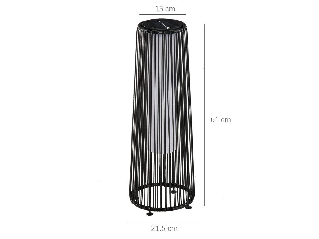 Toto solární zahradní světlo se vyznačuje výrazným tkaným designem v nadčasovém vzhledu přírodního ratanu. Robustní ocelový rám s práškovým nástřikem je integrován do stupňovitého válcového stínidla, což vytváří výrazný vzhled a zajišťuje vysokou stabilitu. Plné nabití poskytuje osm hodin svícení, světlo se automaticky zapíná a vypíná a dobíjí se za denního světla, takže není potřeba napájení ze sítě.