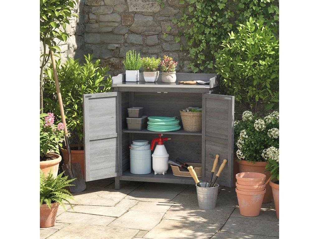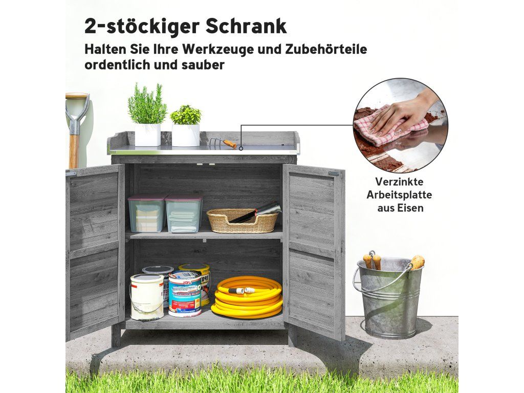 Kompaktní úložný prostor Řešení: Dvě vnitřní přihrádky a snadno udržovatelná pracovní deska s pozinkovaným kovovým obložením a praktický zvýšený okraj zahradní skříňky nabízejí dostatek prostoru pro různé zahradní nářadí a příslušenství.