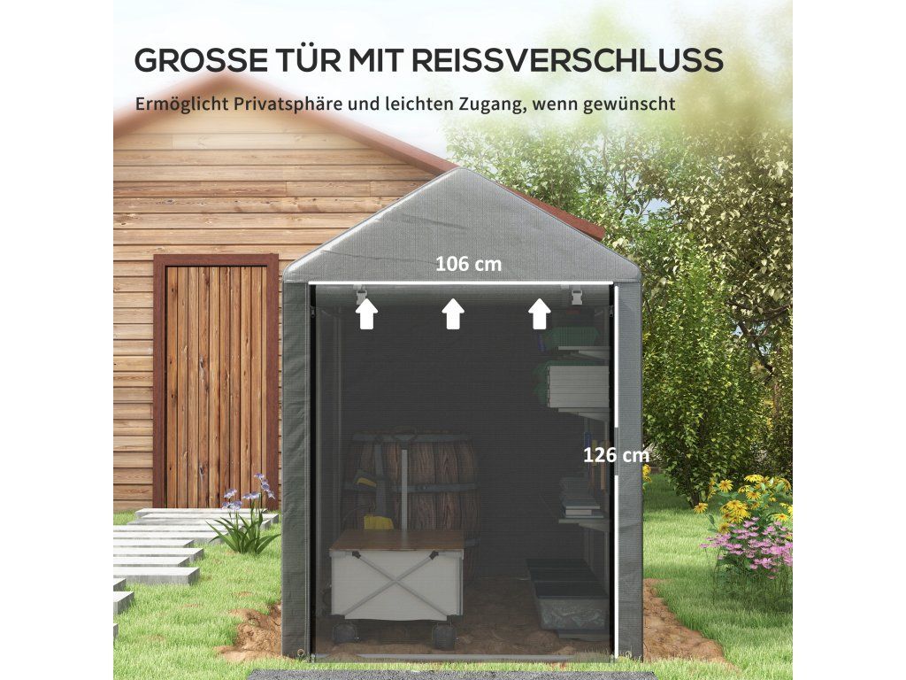 Snadný přístup: Tento venkovní domek je vybaven velkými dveřmi na zip a umožňuje snadný přístup a bezpečné uložení vašeho venkovního vybavení.