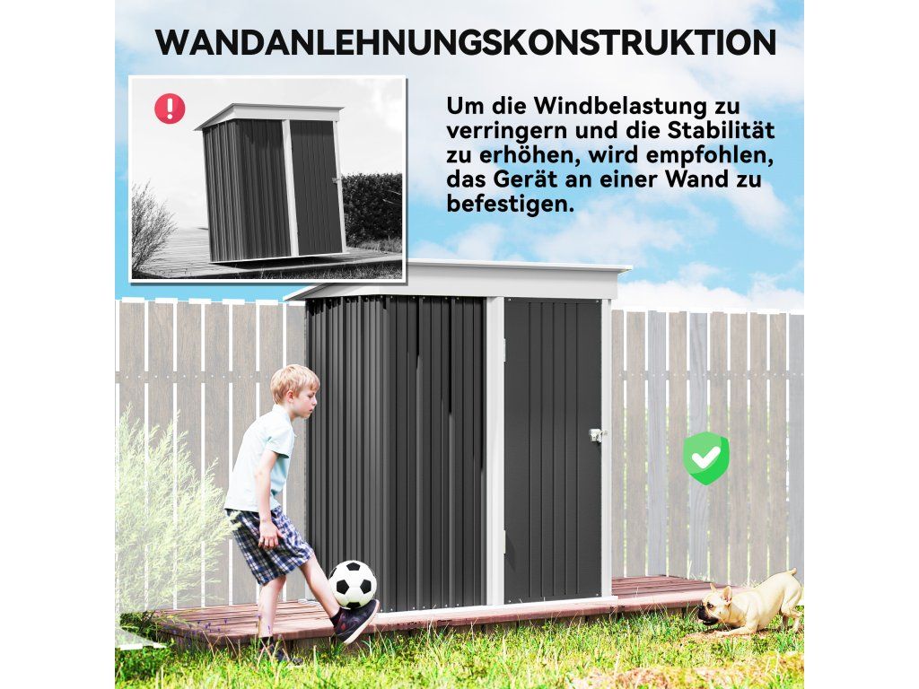 Stabilní konstrukce: Díky vodotěsnému, pozinkovanému ocelovému rámu je tento domek ideální pro celoroční venkovní použití. Konstrukce pultové střechy poskytuje dodatečnou stabilitu díky sousedním konstrukcím ve vaší zahradě.