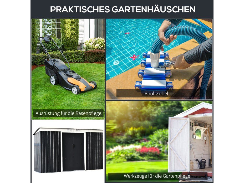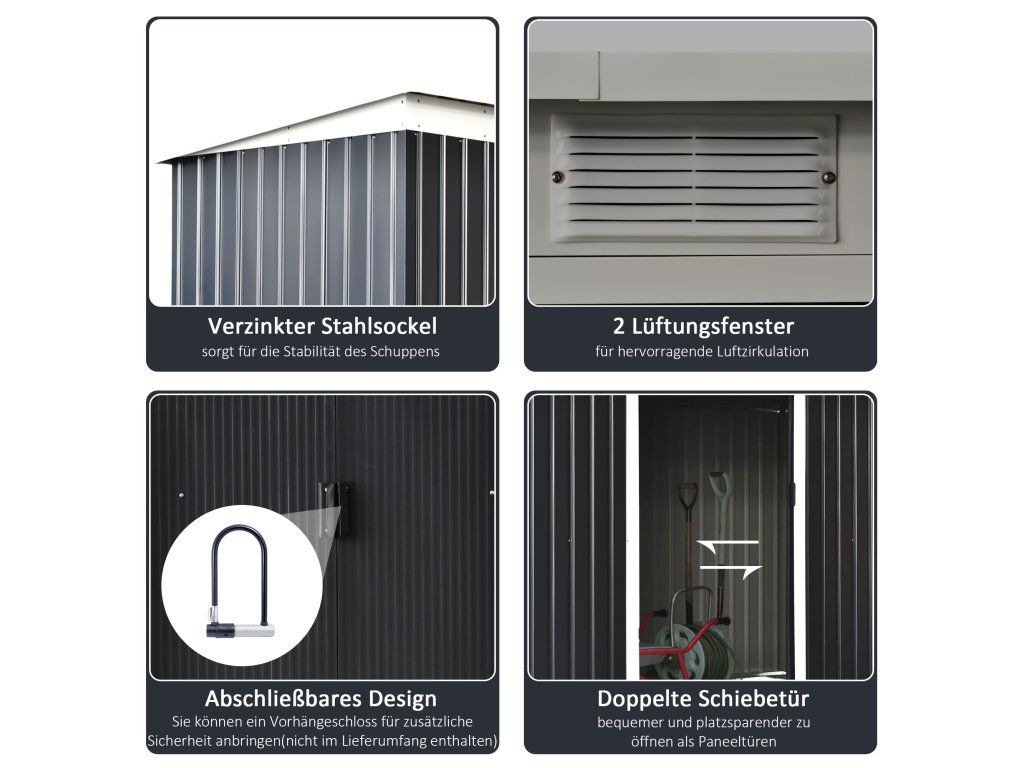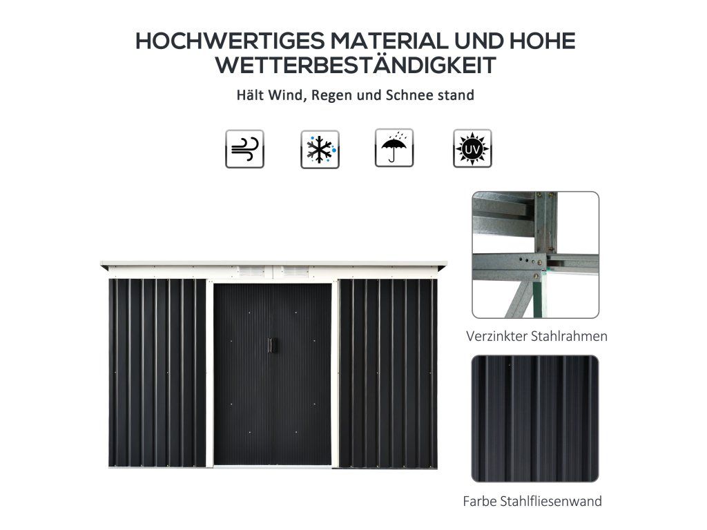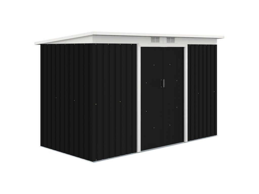 ODOLNOST VŮČI POVĚTRNOSTNÍM VLIVŮM: Ocel je potažena plastovou fólií, díky čemuž je zahradní domek odolný vůči povětrnostním vlivům a nečistotám. Šikmá střecha umožňuje shromažďování dešťové vody.