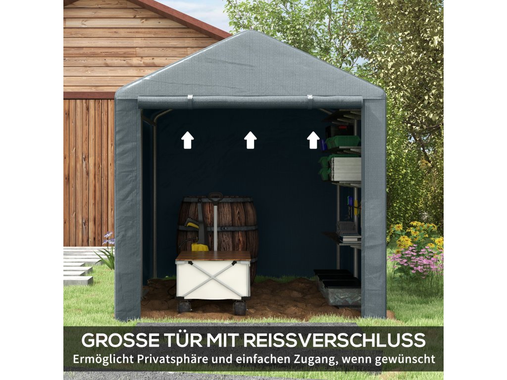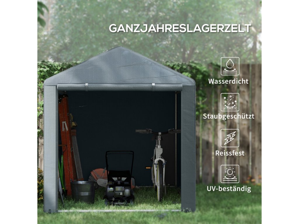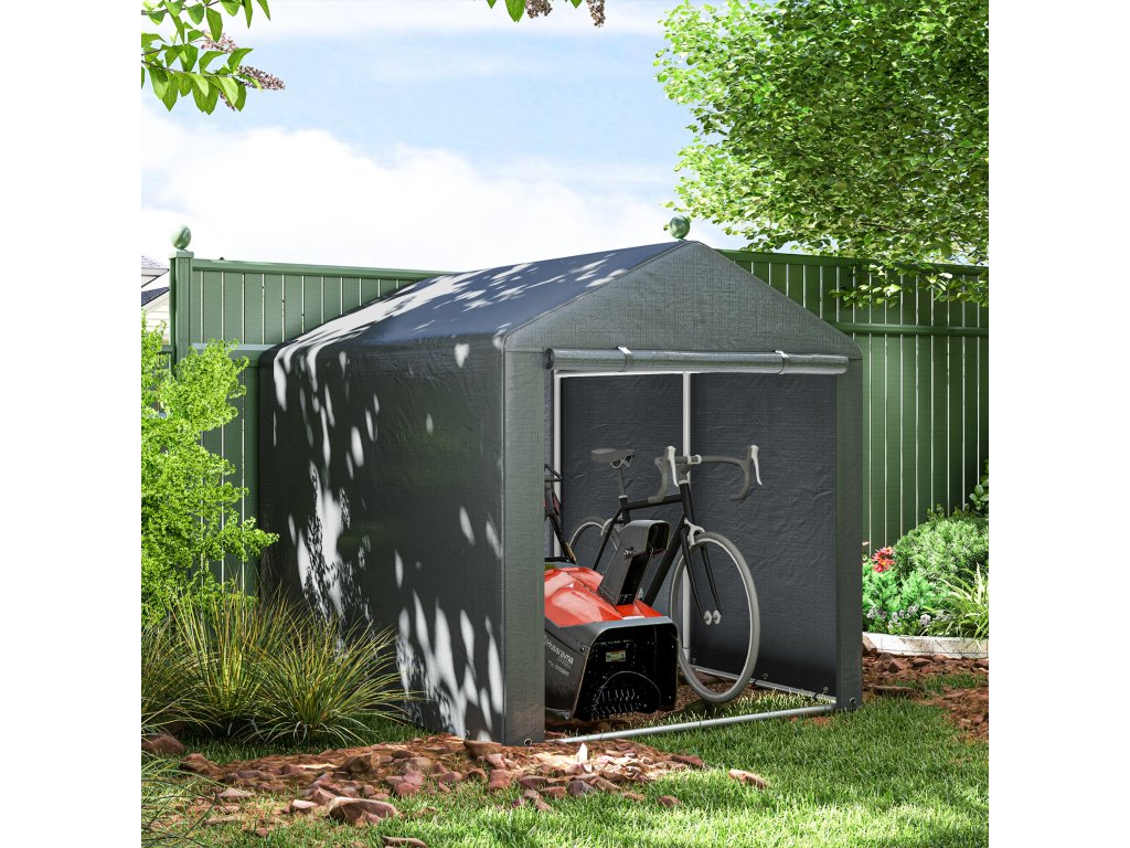 Objevte pohodlí zahradního domku, prostorného útočiště pro vaše kolo, motocykl nebo zahradní nářadí. Díky krytu odolnému proti UV záření a robustnímu rámu z pozinkované oceli chrání vaše věci před lehkým větrem, deštěm a nečistotami. Velký vchod na zip umožňuje snadný přístup a bezproblémové uložení. Ideální do jakéhokoli venkovního prostoru!